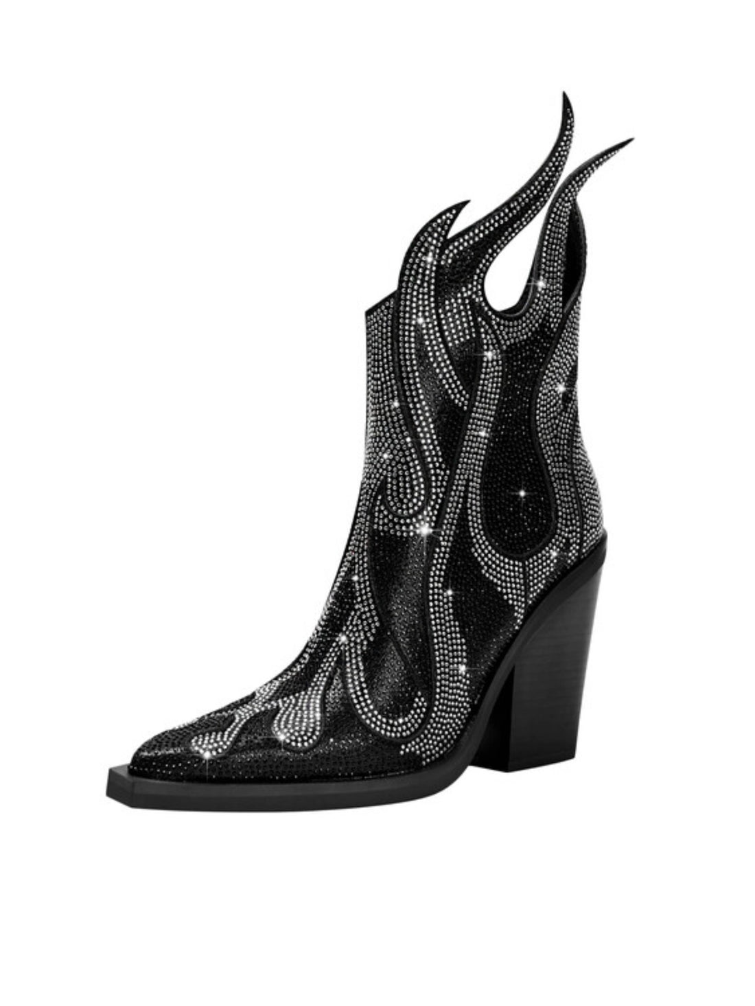 Dramatic black cowgirl boots with rhinestone flame edge design, soaring high heels, and elegant pointed...