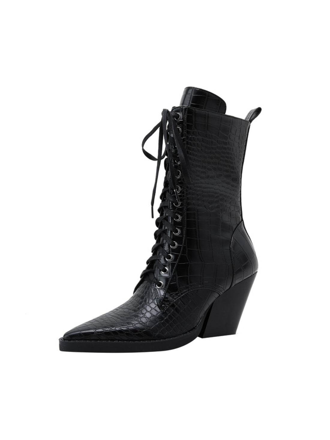 Lizard Embossed Pointed Black Western Lace-Up Boots
