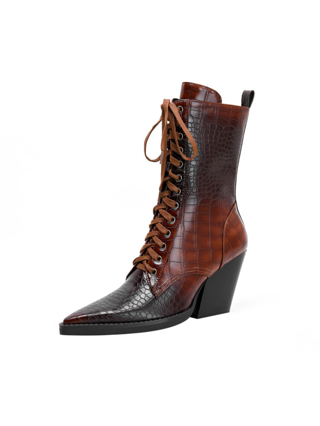 Lizard Embossed Pointed Toe Lace-Up Brown Western Boots for Women