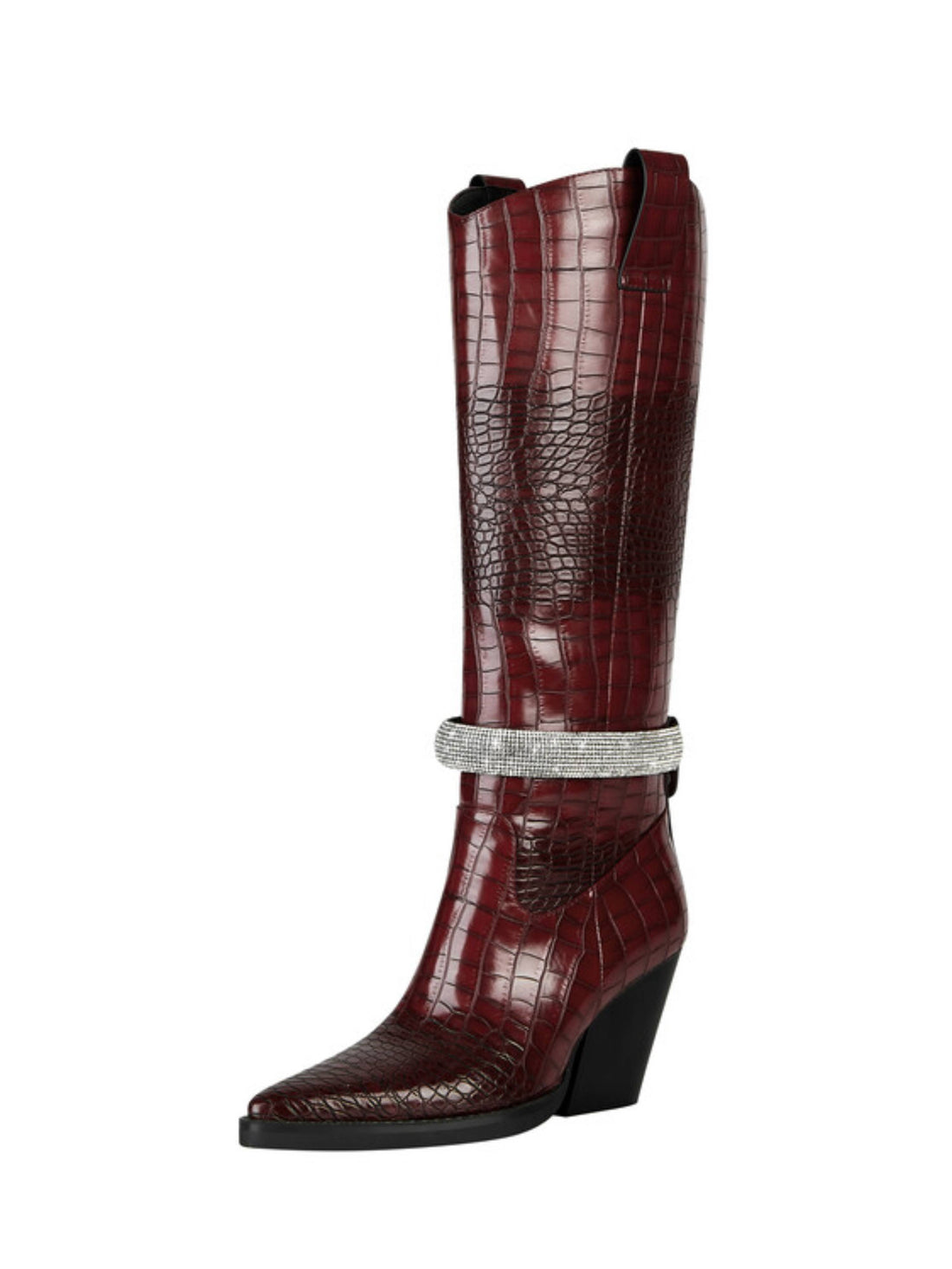 Luxurious dark burgundy knee high cowgirl boots with glitter strap details and elegant embossed texture....