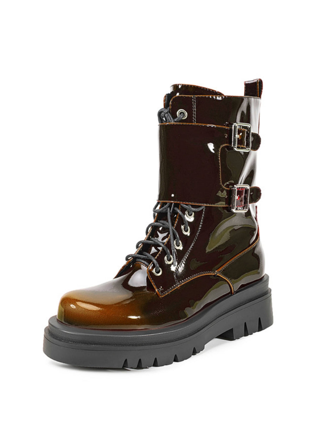 Edgy ombre brown combat boots featuring gradient patent leather finish, buckled belt details, sturdy lace-up...