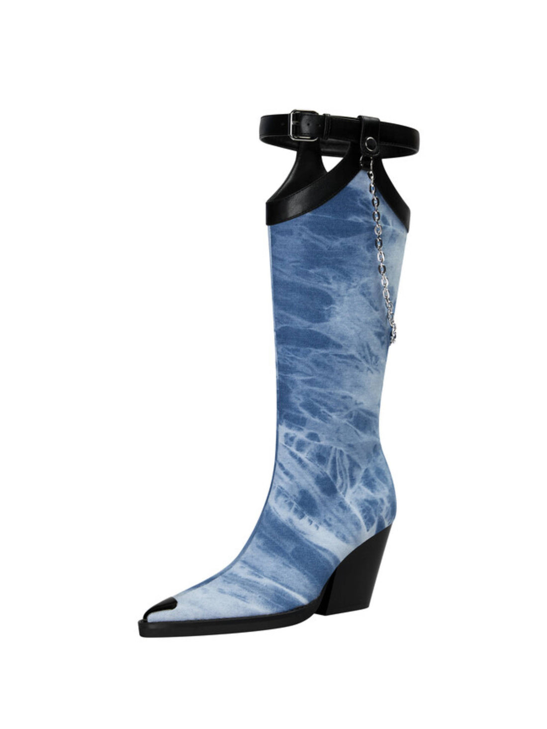 Fashion Denim Blue Buckled Belt Chain Knee High Cowgirl Boots