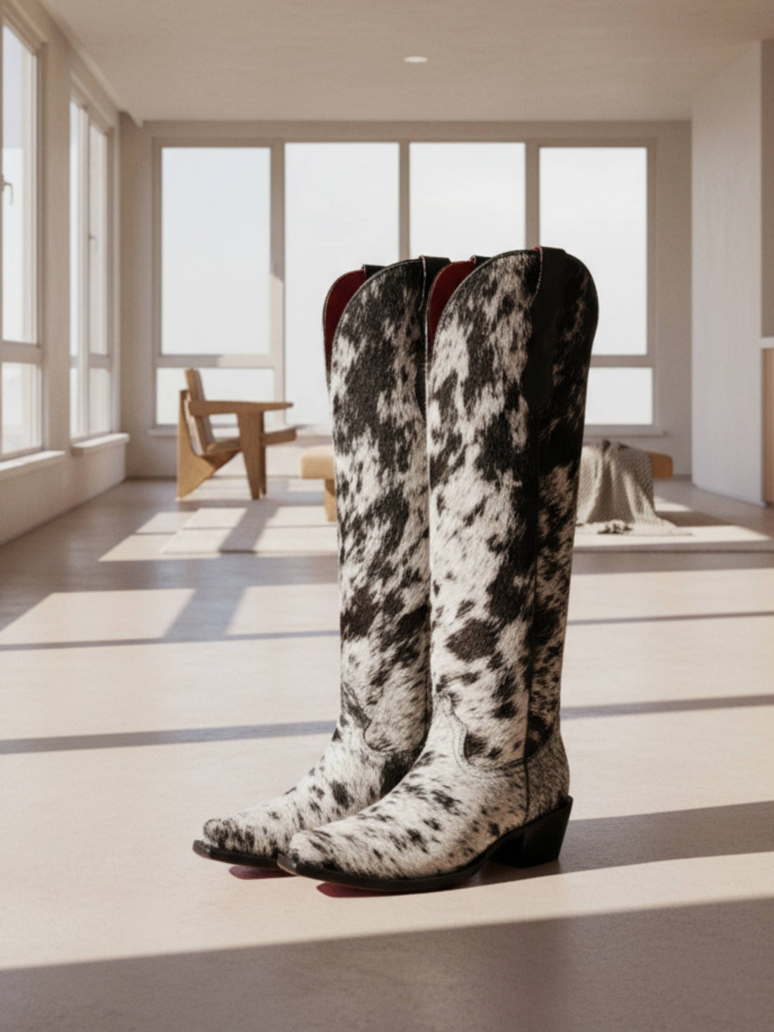 Black & White Cow Pattern Vegan Calf Knee-High Snip Toe Cowgirl Boots
