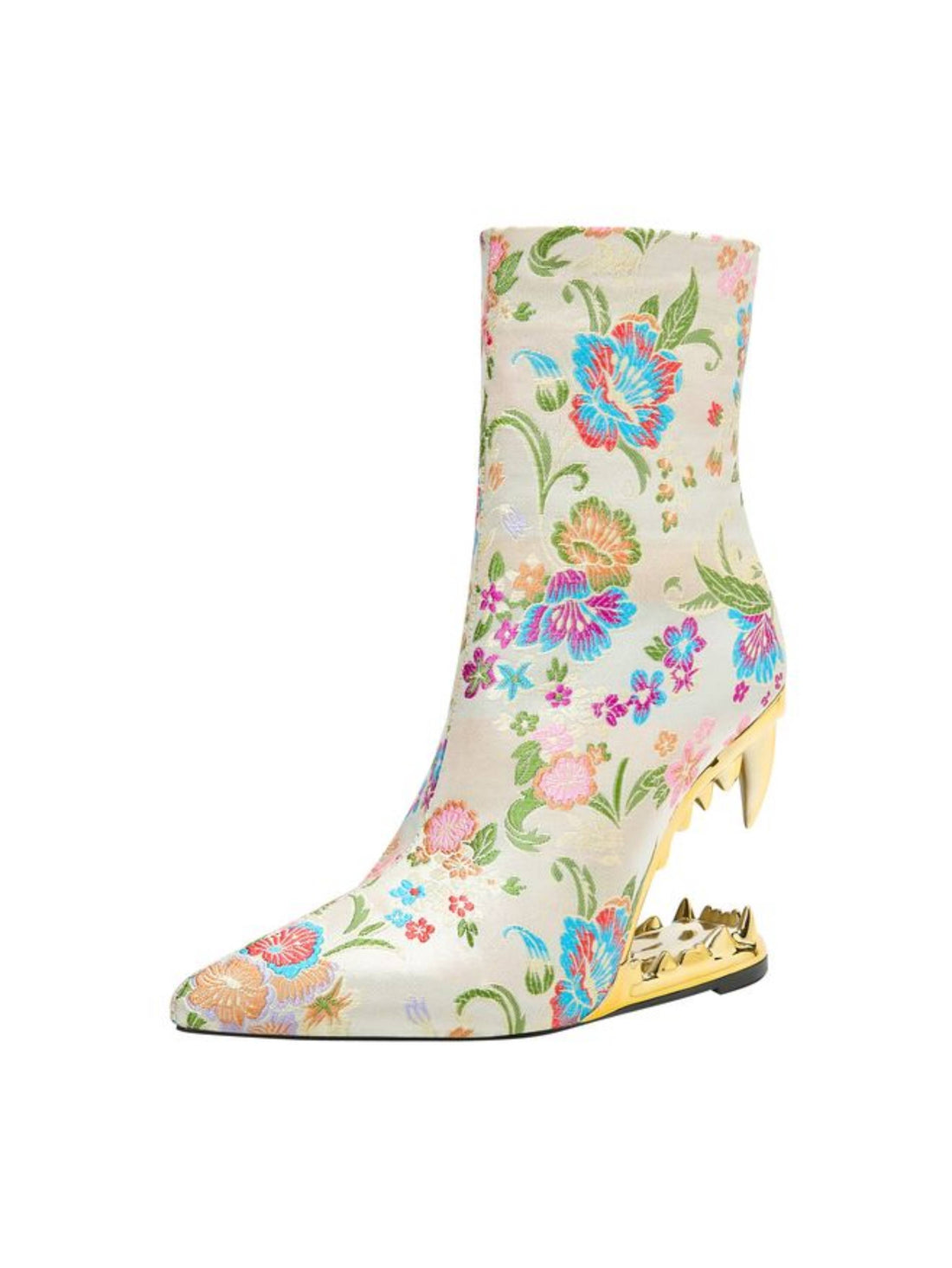 Tiger Teeth Heel Pointed Toe Classic Floral Ivory Ankle Boots