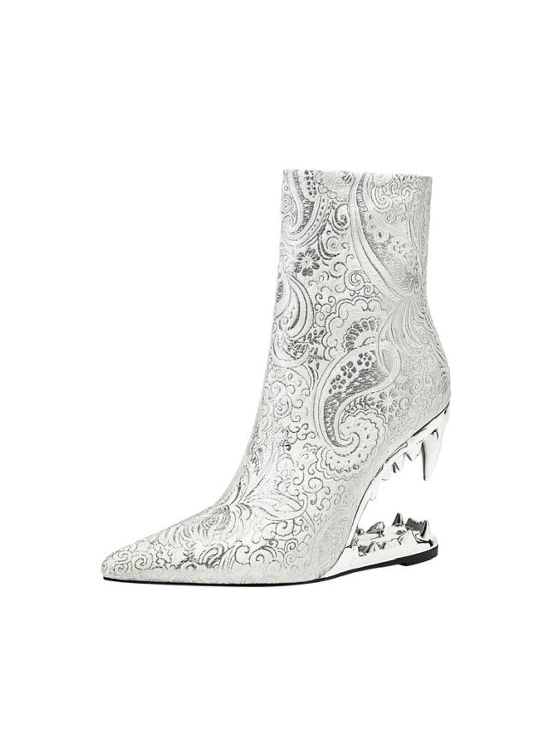 White and Silver Floral Tiger Teeth Heel Pointed Toe Short Boots