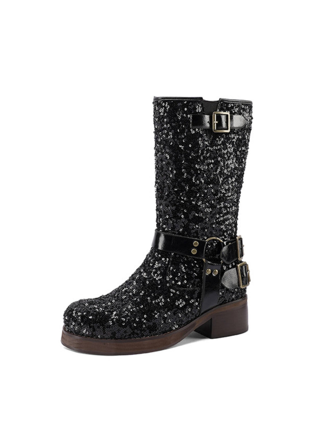 Full Sequin Buckled Low Heels Black Platform Boots for Women