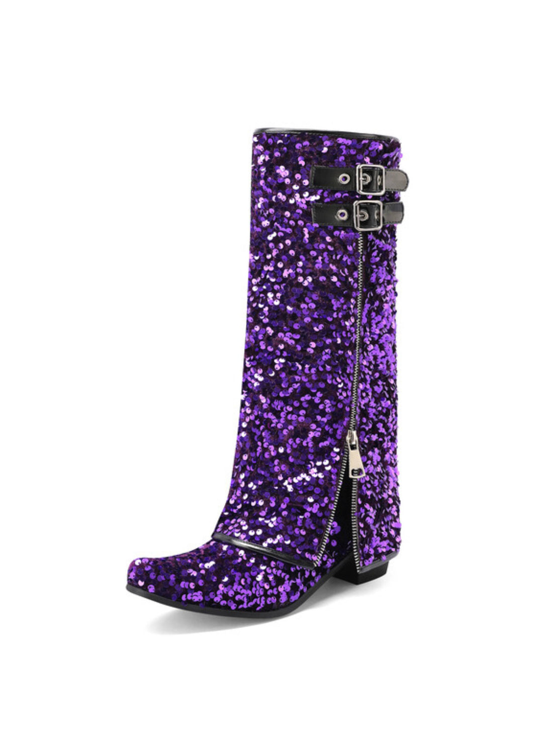 Purple Sequin Buckled Fold Over Snip Toe Western Boots for Women