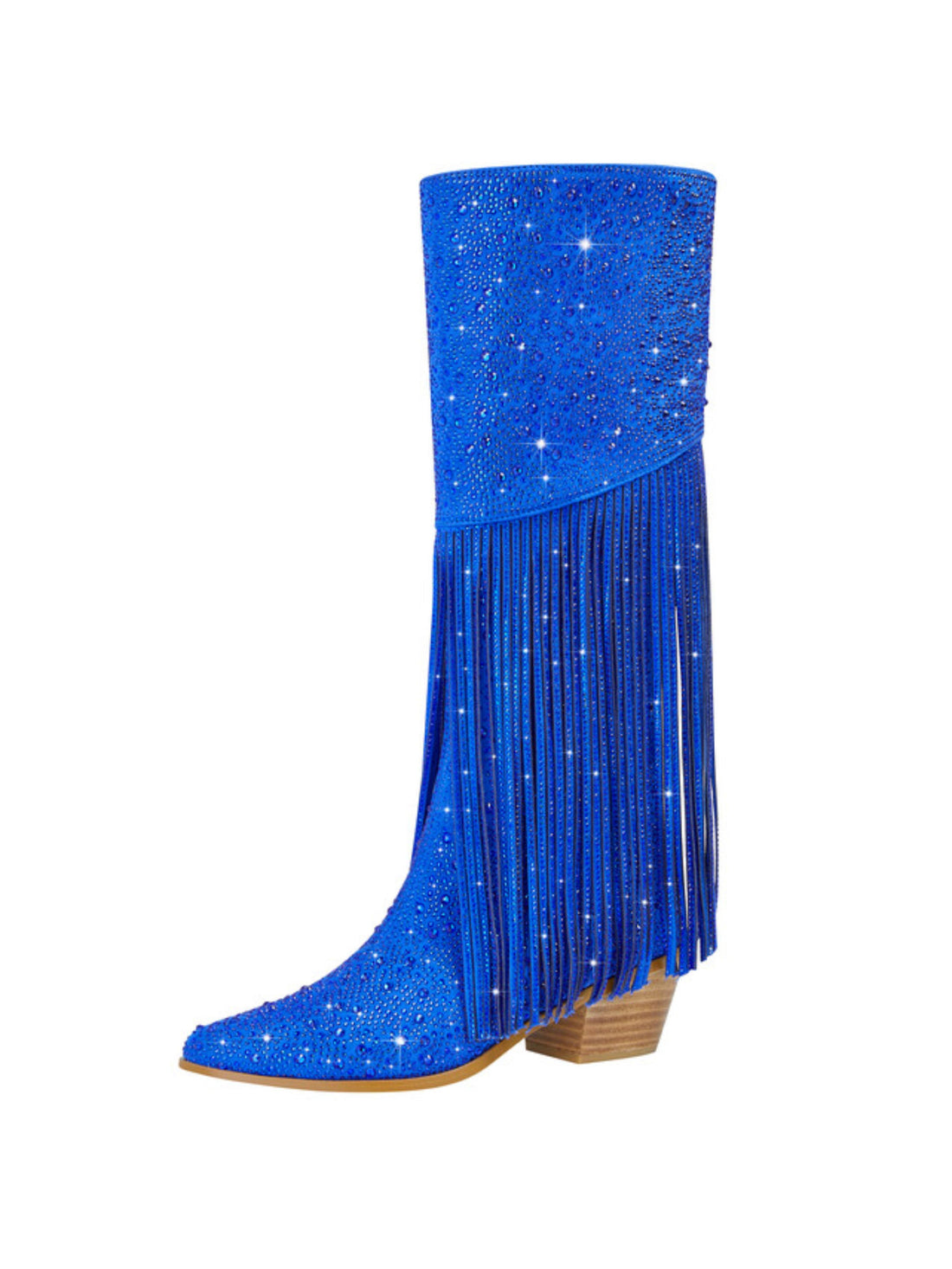 Blue Full Rhinestone Knee High Fringe Cowgirl Boots