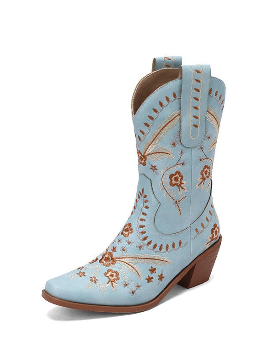 Women's Embroidered Blue Mid Calf Denim Cowboy Boots
