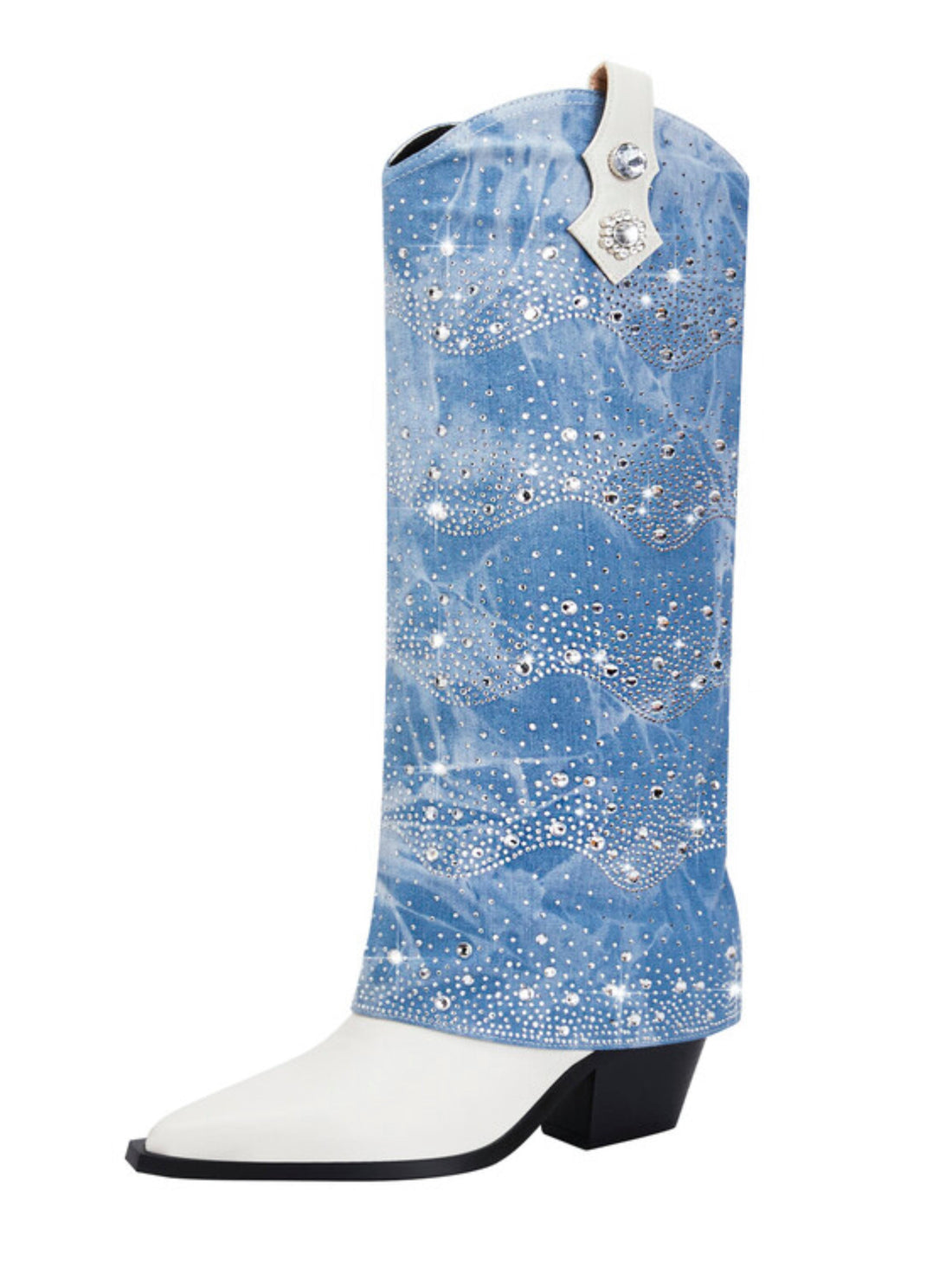 Shining White & Blue Fold Over Rhinestone Pointed Toe Western Boots