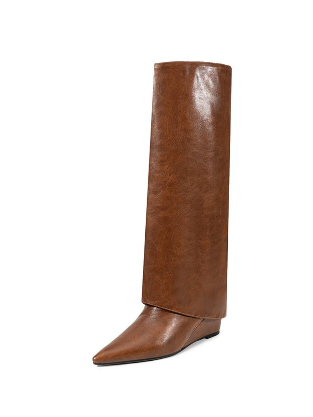 Classic Brown Fold Over Mid Calf Wedge Boots for Women