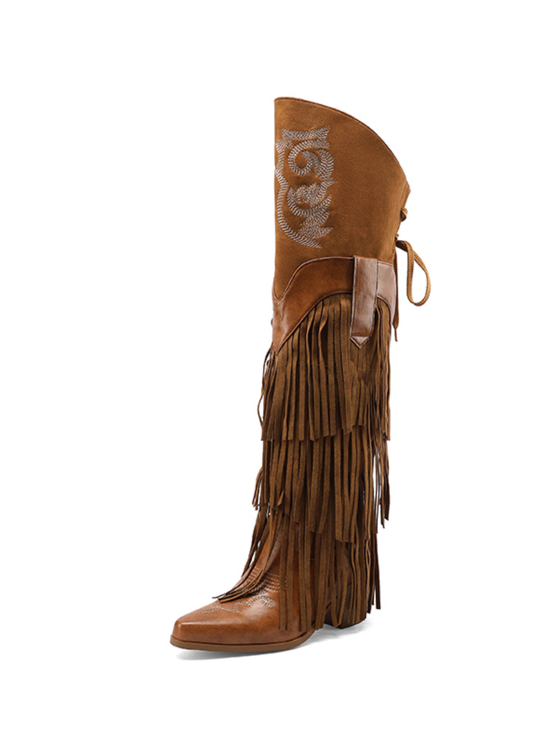 Classic Brown Lace-Up & Fringe Knee High Cowgirl Boots