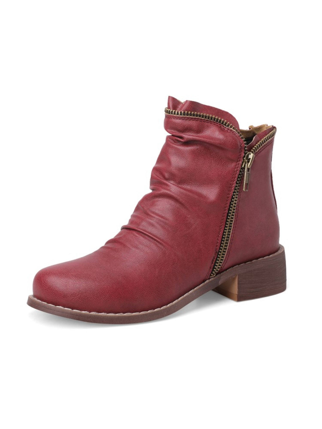 Women's Plus Size Wrinkled Burgundy Ankle Boots with Double Zipper