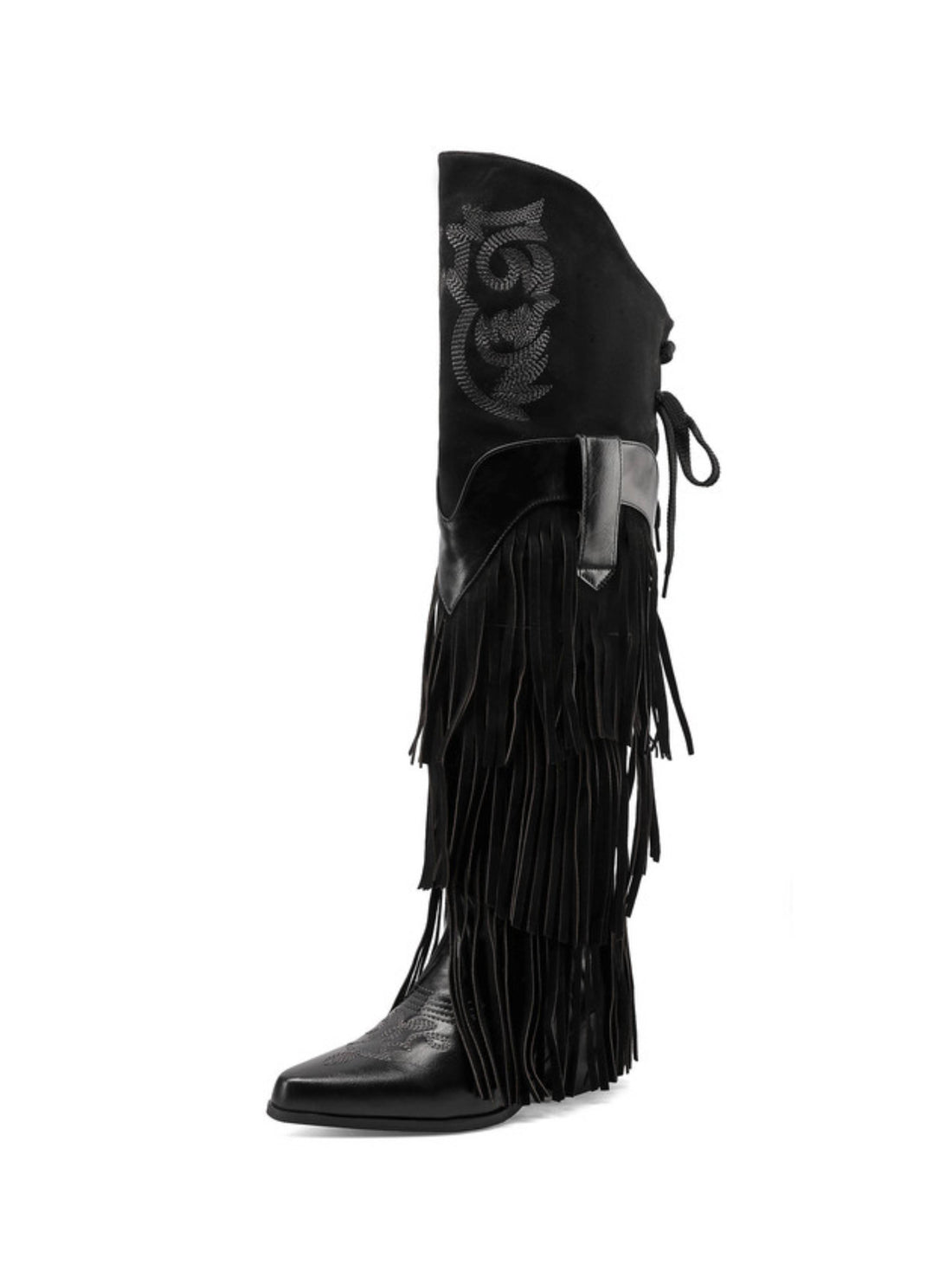 Trendy Knee High Black Cowgirl Boots with Fringe