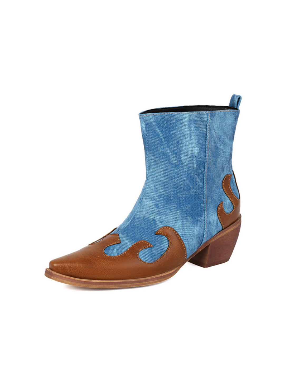 Denim Blue and Brown Patchwork Snip Toe Ankle Cowgirl Booties
