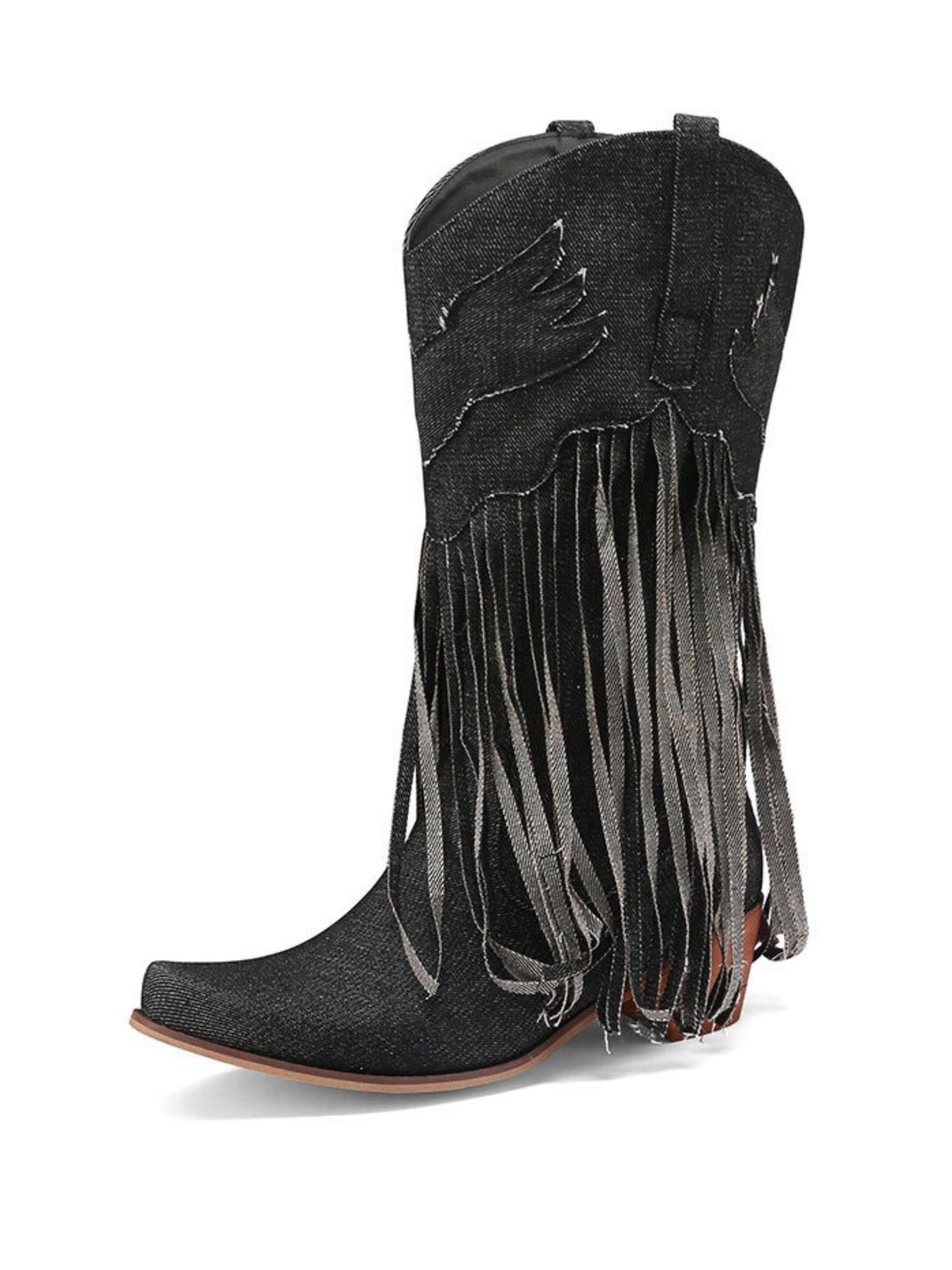 Denim Women's Mid Calf Black Fringe Cowboy Boots feature an embroidered western style, mid-calf length,...