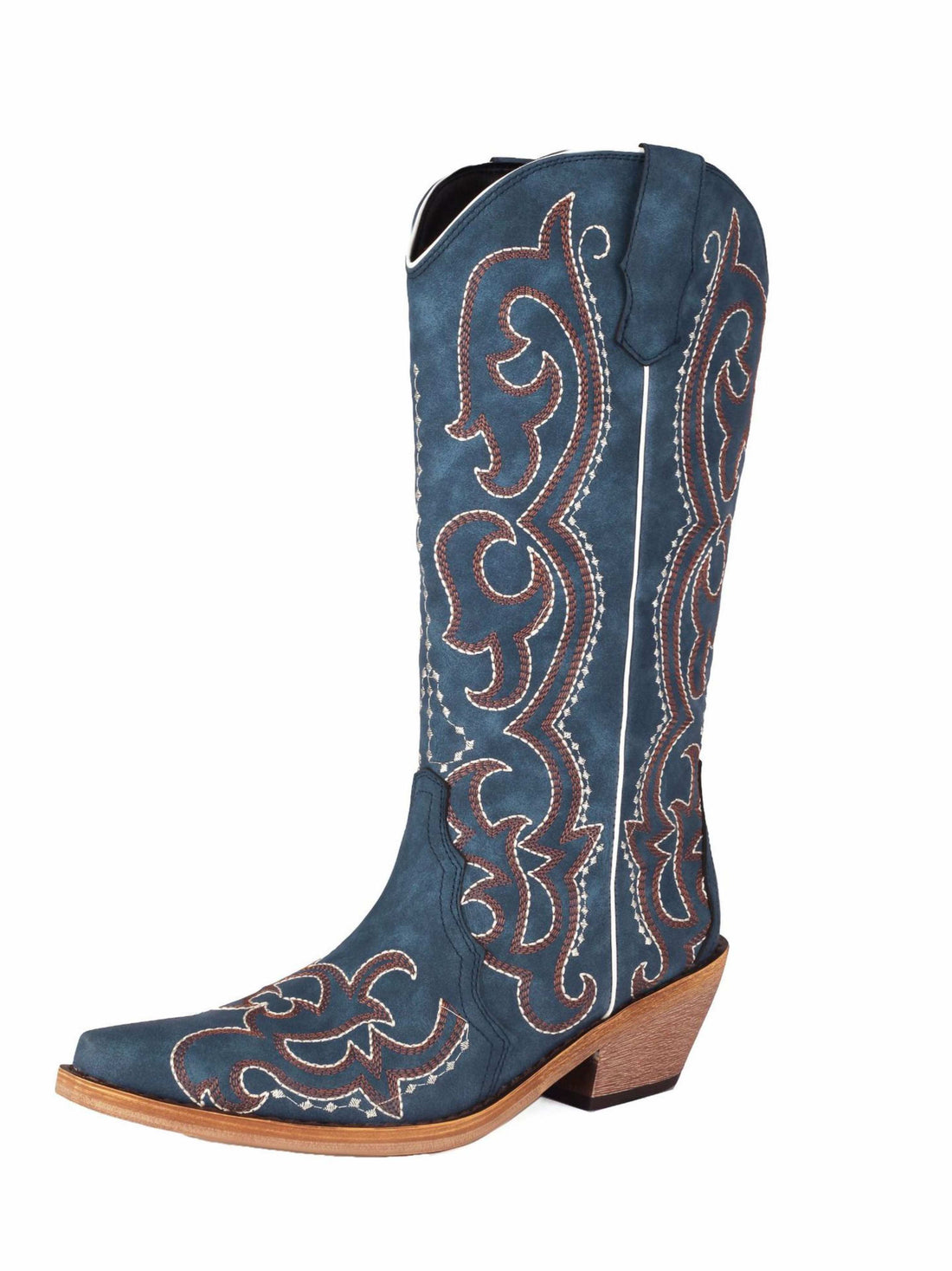 Denim Embroidered Snip Toe Blue Cowgirl Boots feature an embroidered western style, mid-calf length, and comfortable...