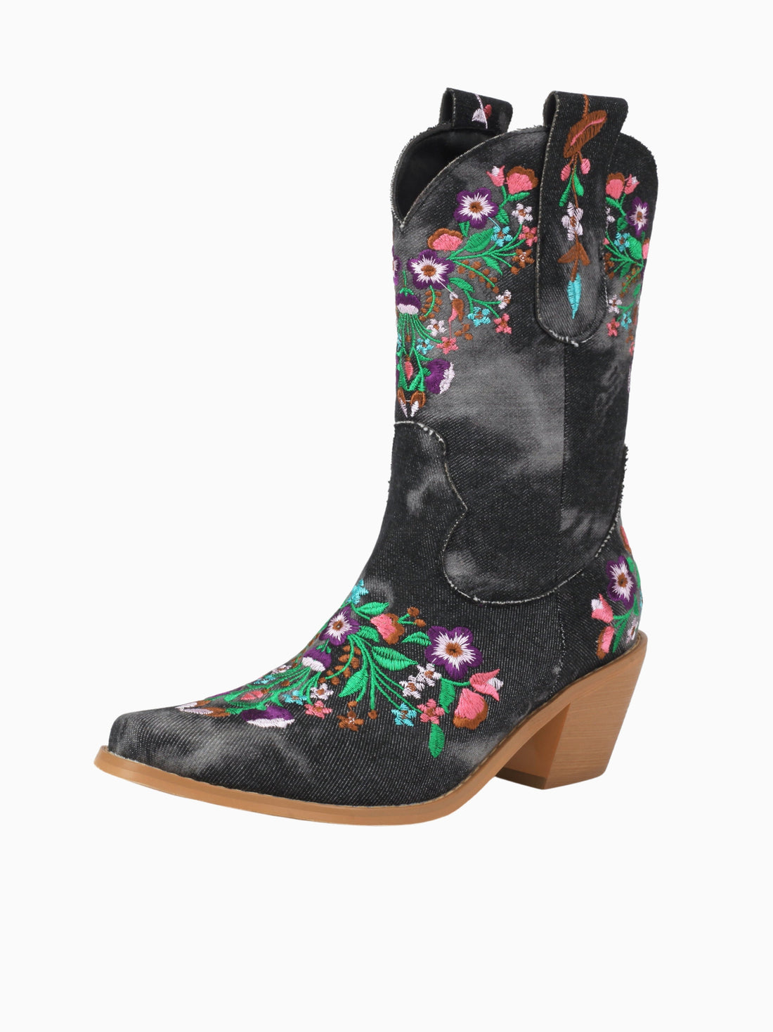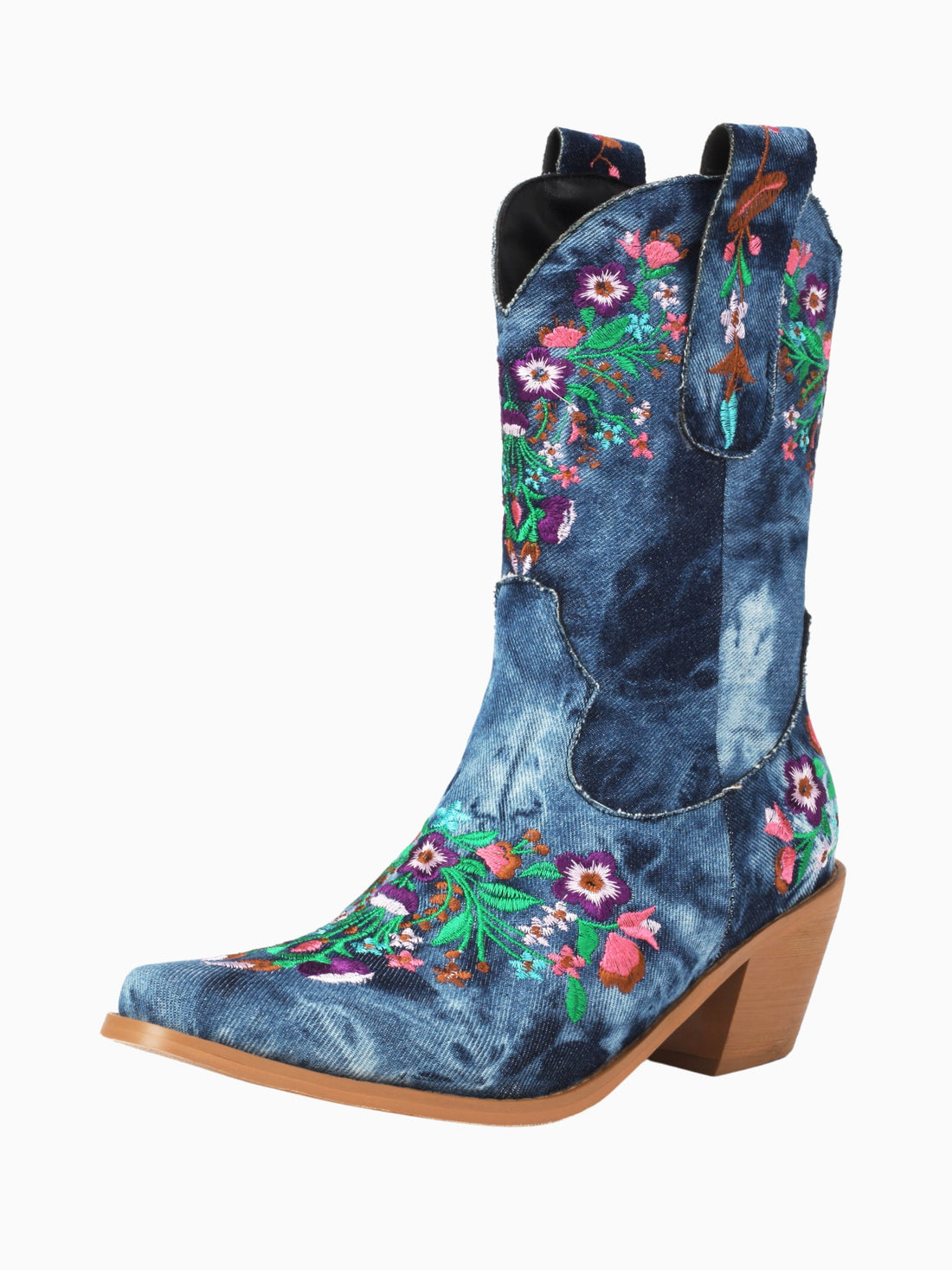 Women's Embroidered Blue Mid Calf Denim Cowboy Boots