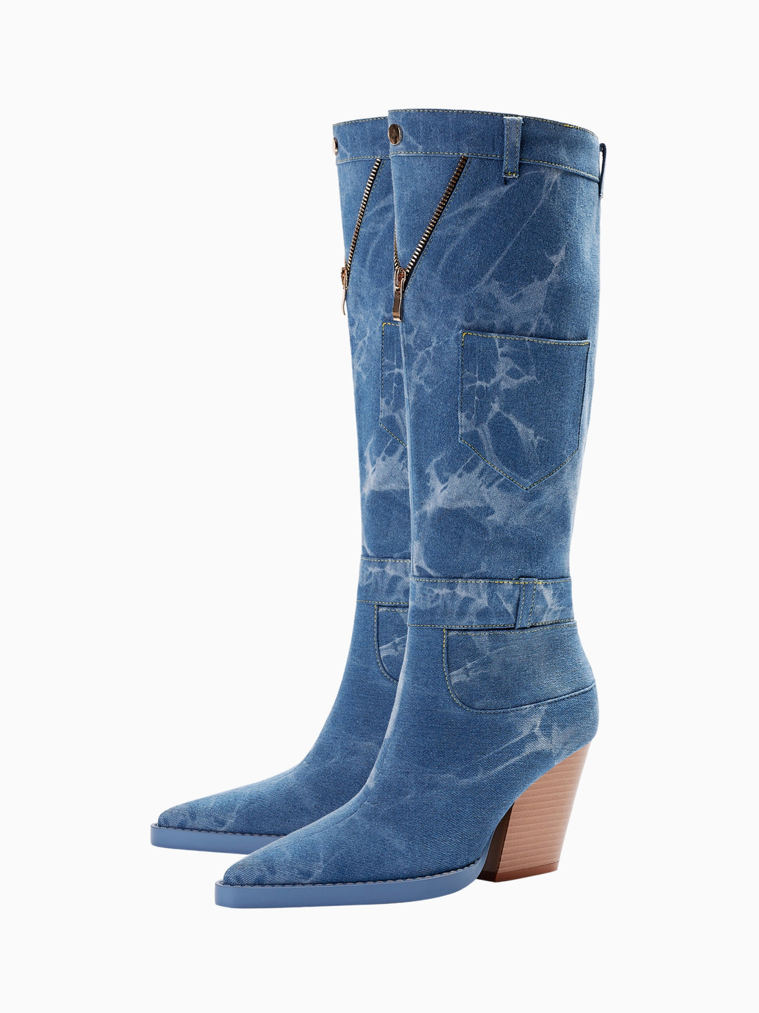 Marble Zip Jean High Heeled Pointed Toe Blue Cowgirl Boots