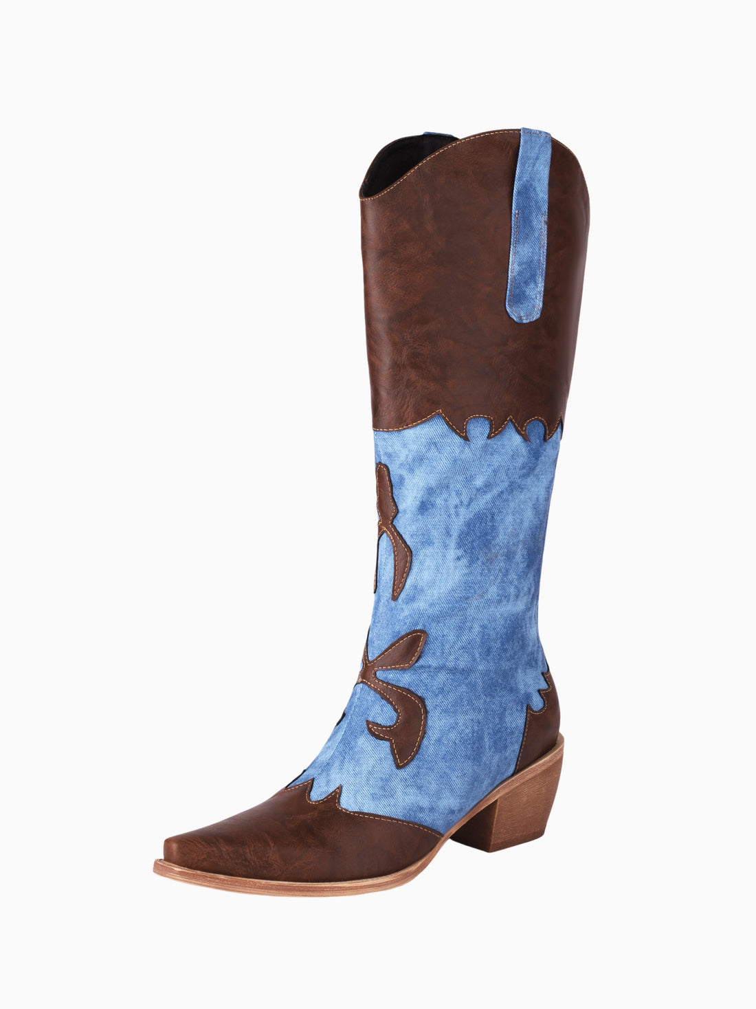 Retro Two-tone Denim Knee High Cowgirl Boots
