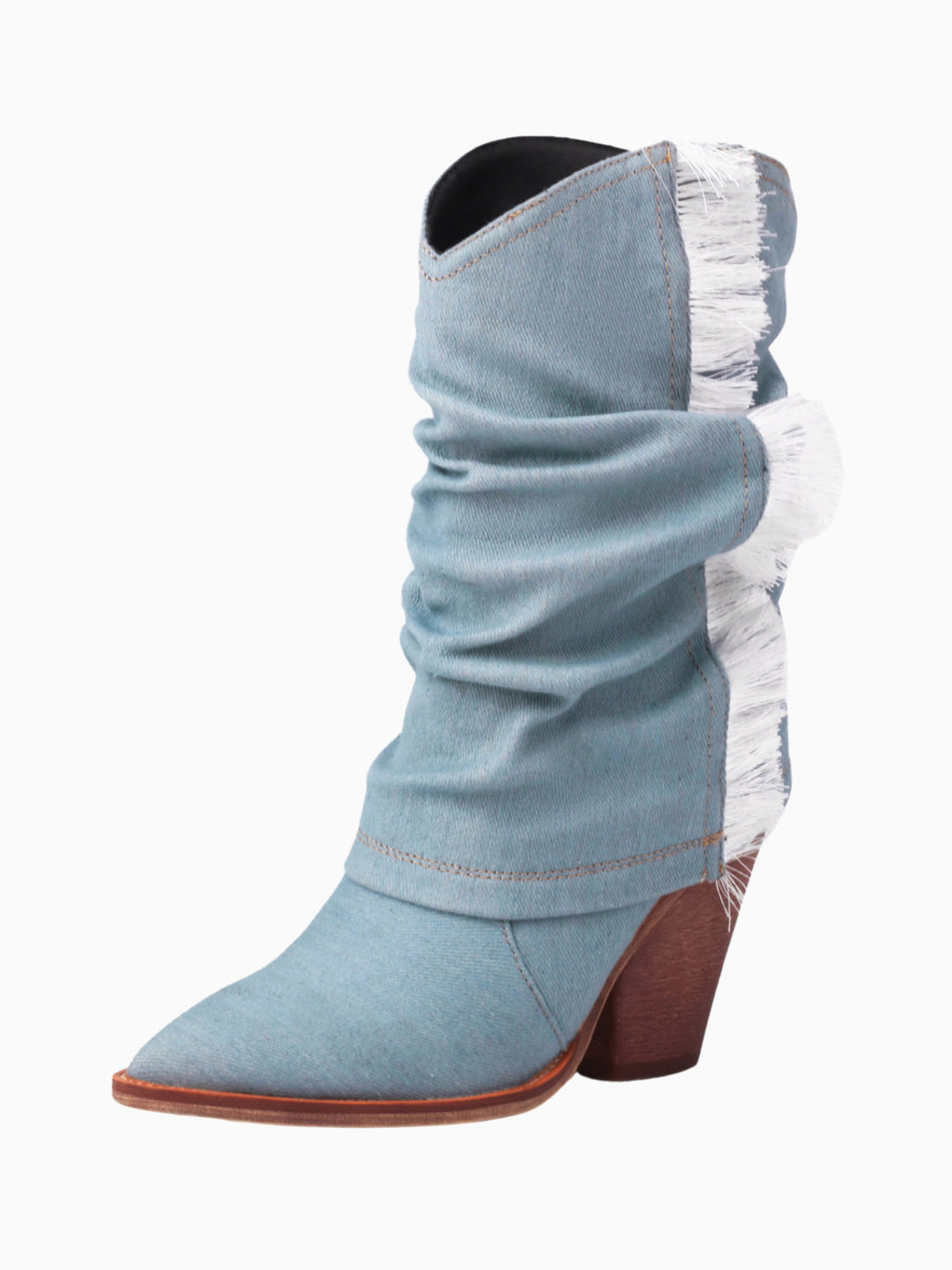 Pointed Toe Heeled Denim Blue Slouch Cowgirl Boots with Ruffles