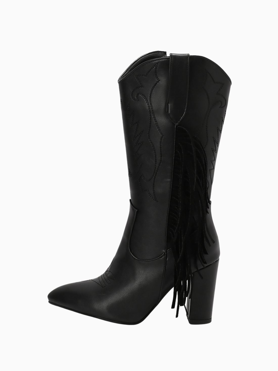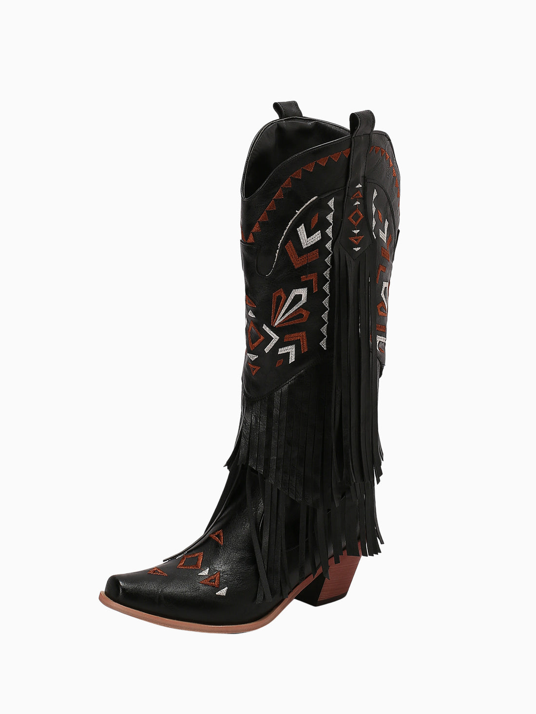 The bold black cowgirl boots feature an intricate embroidered pattern accentuated by dramatic fringe detailing,...