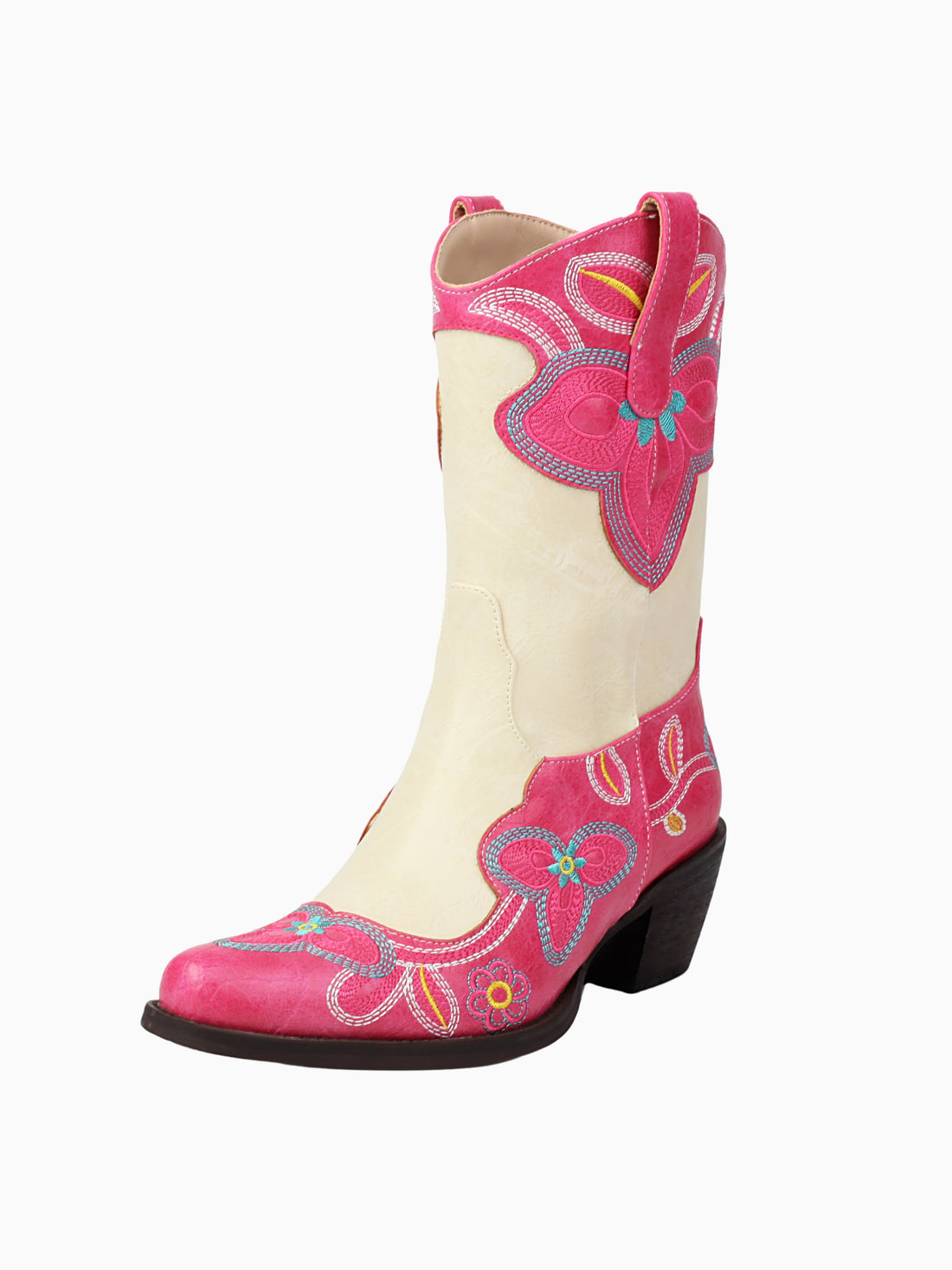 Charming two-tone cowgirl boots featuring vibrant pink floral embroidery on cream base, accented with turquoise...