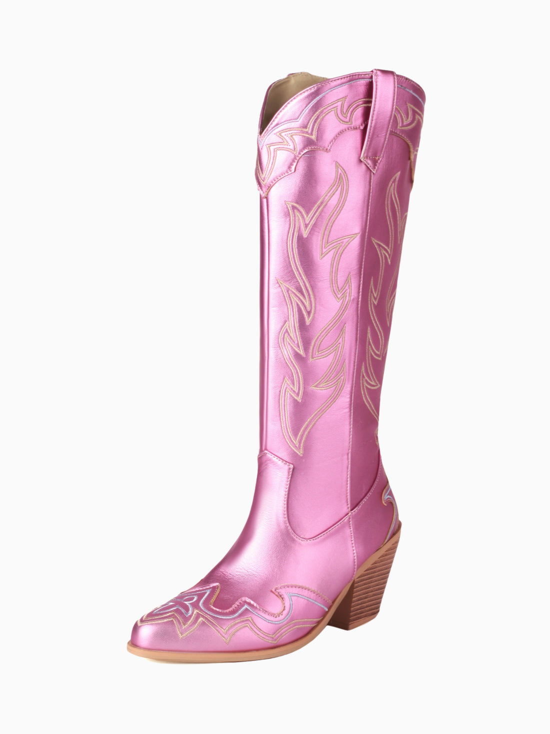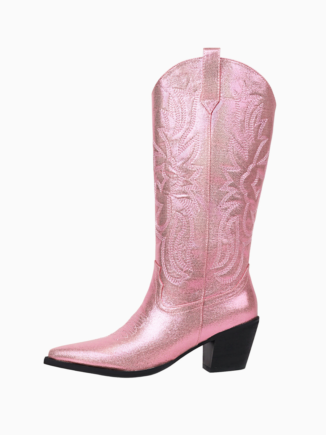 Glowing with a metallic pink sheen, Metallic Shimmer Pink Cowgirl Boots feature exquisite embroidered patterns....
