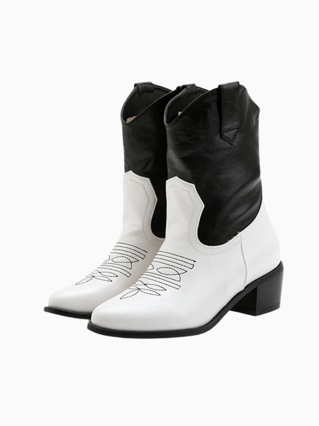 Contemporary two-tone cowgirl boots featuring a striking black and white color block design with minimal...