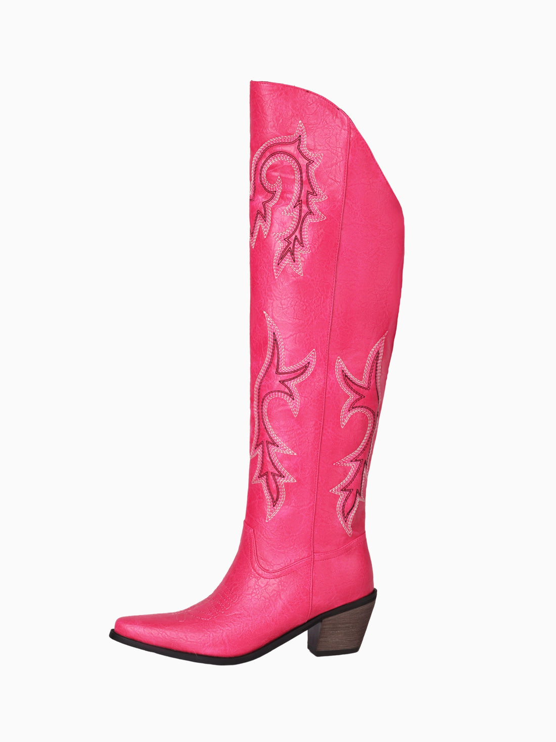 Eye-catching pink Over-the-Knee Western boots featuring star-stitch embroidery pattern and stacked heel, perfect for making...