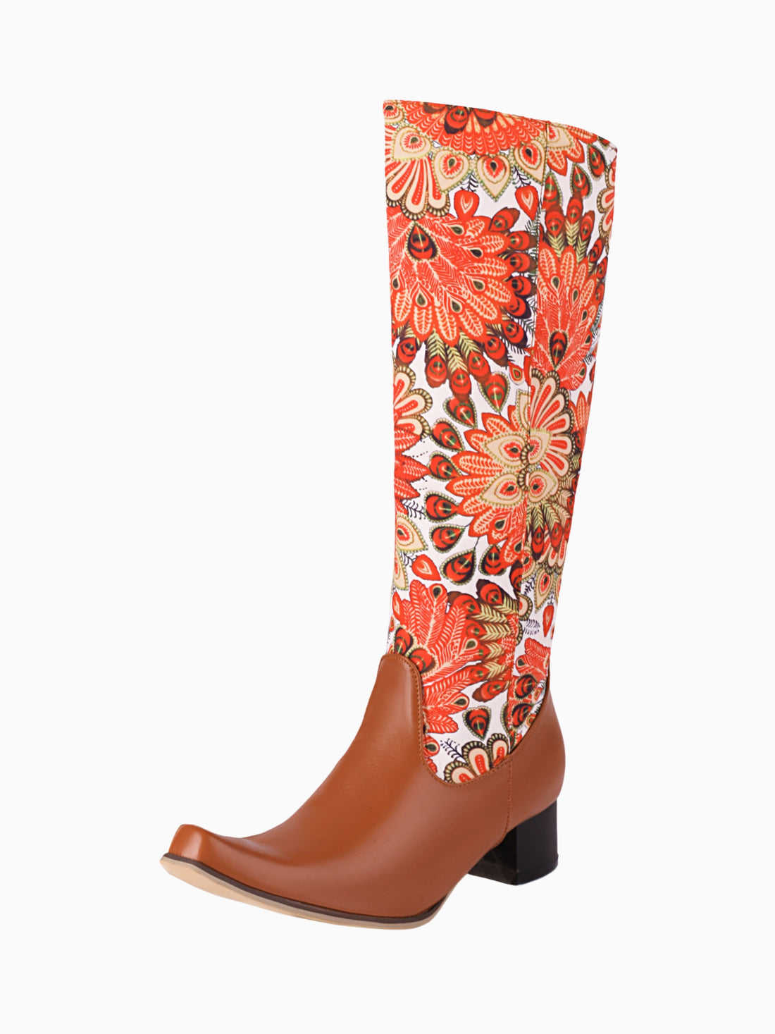 Artfully designed with bohemian flair, the Floral Orange Cowgirl Boots showcase a vibrant mandala print...