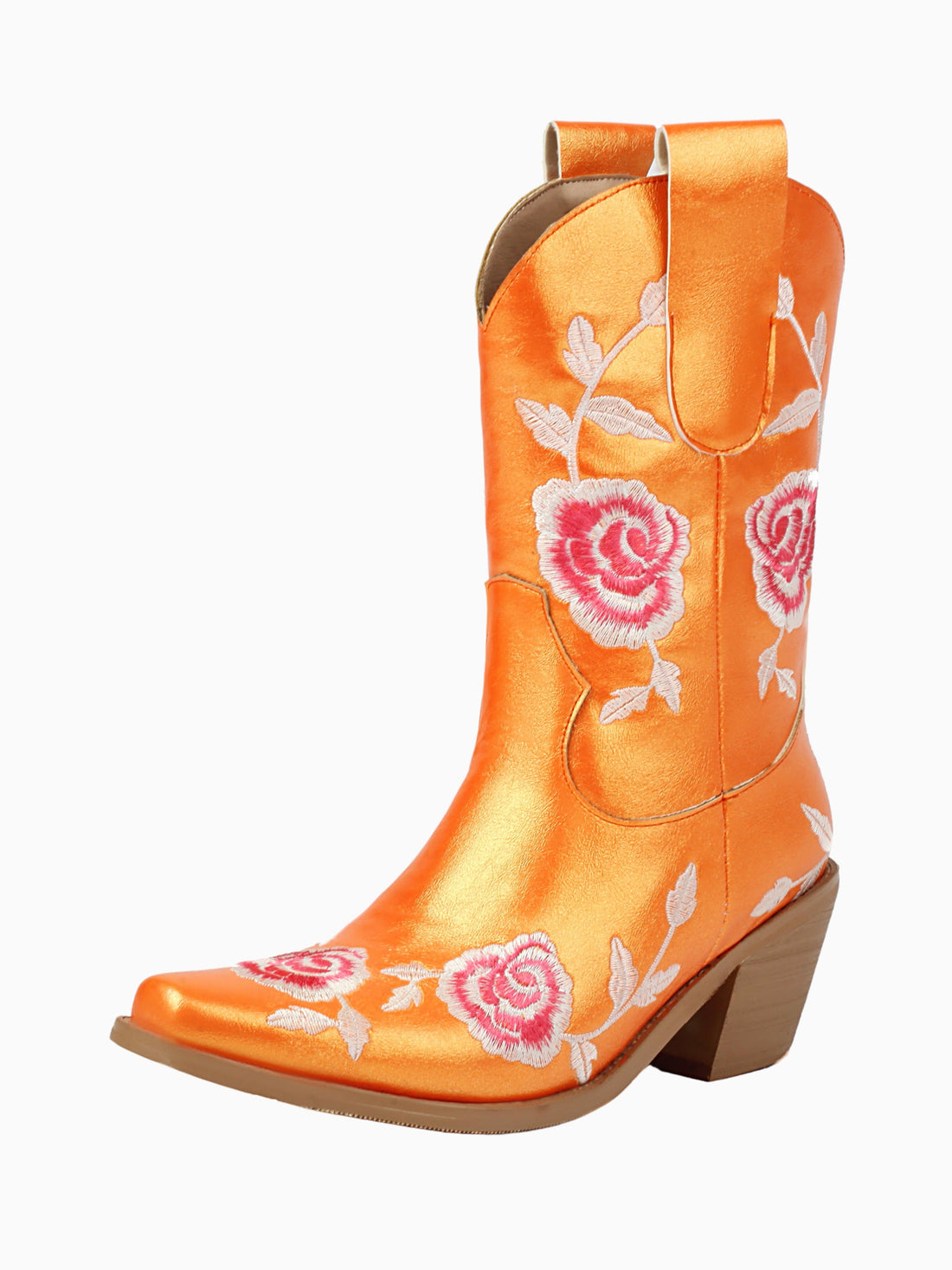 Stunning Orange Mid Calf Floral Western Boots for Women