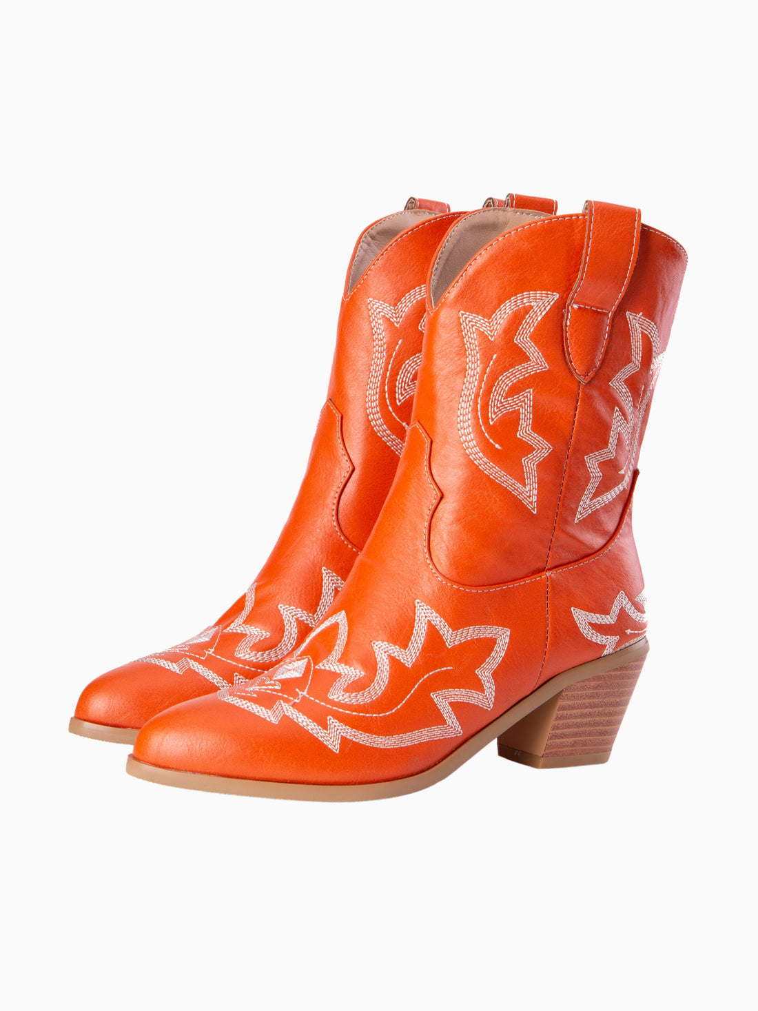 Bold Western ankle boots in eye-catching orange with striking white embroidered patterns. Pointed toe and...