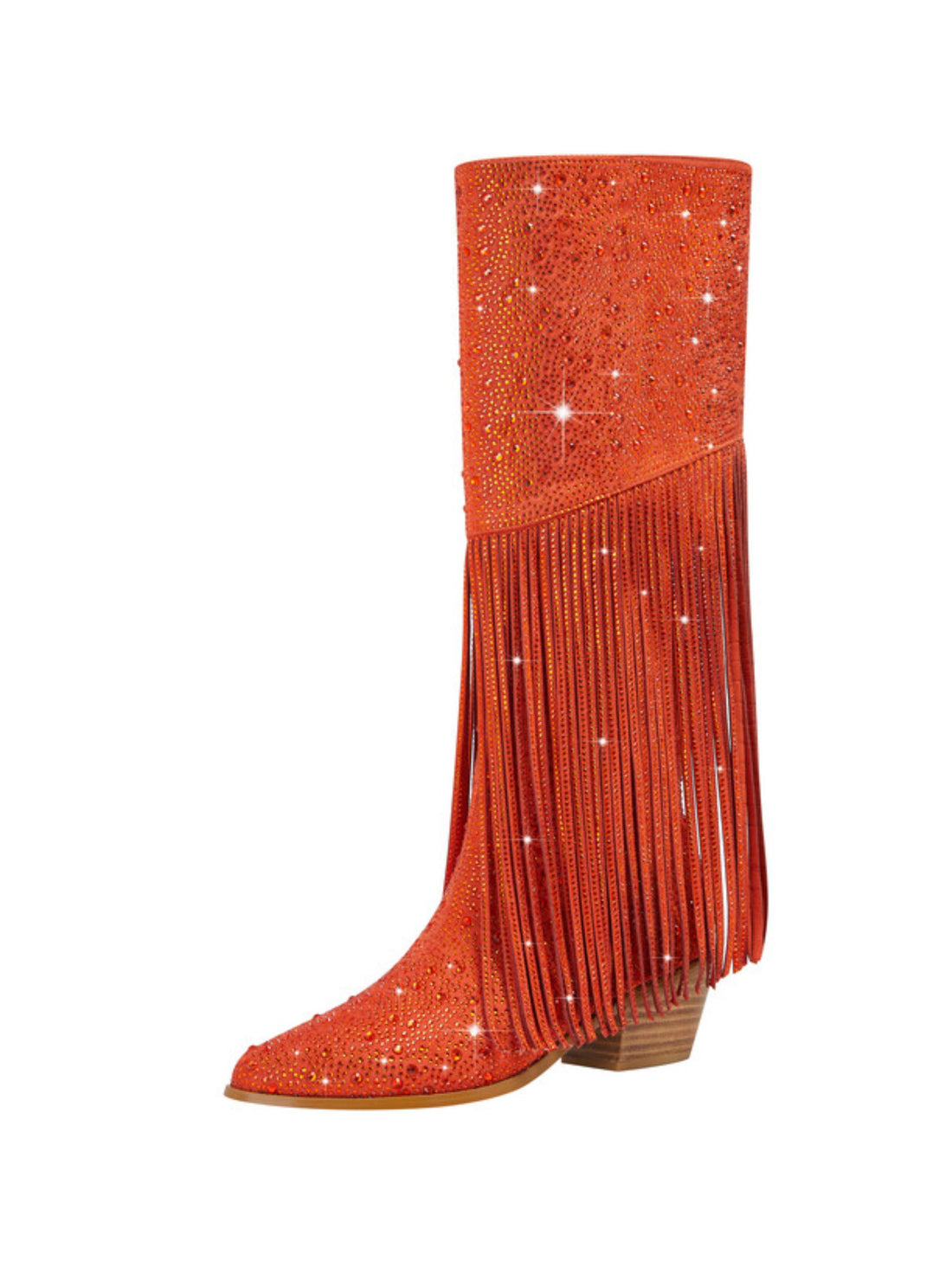 Vibrant Orange Rhinestone Knee High Fringe Cowgirl Boots
