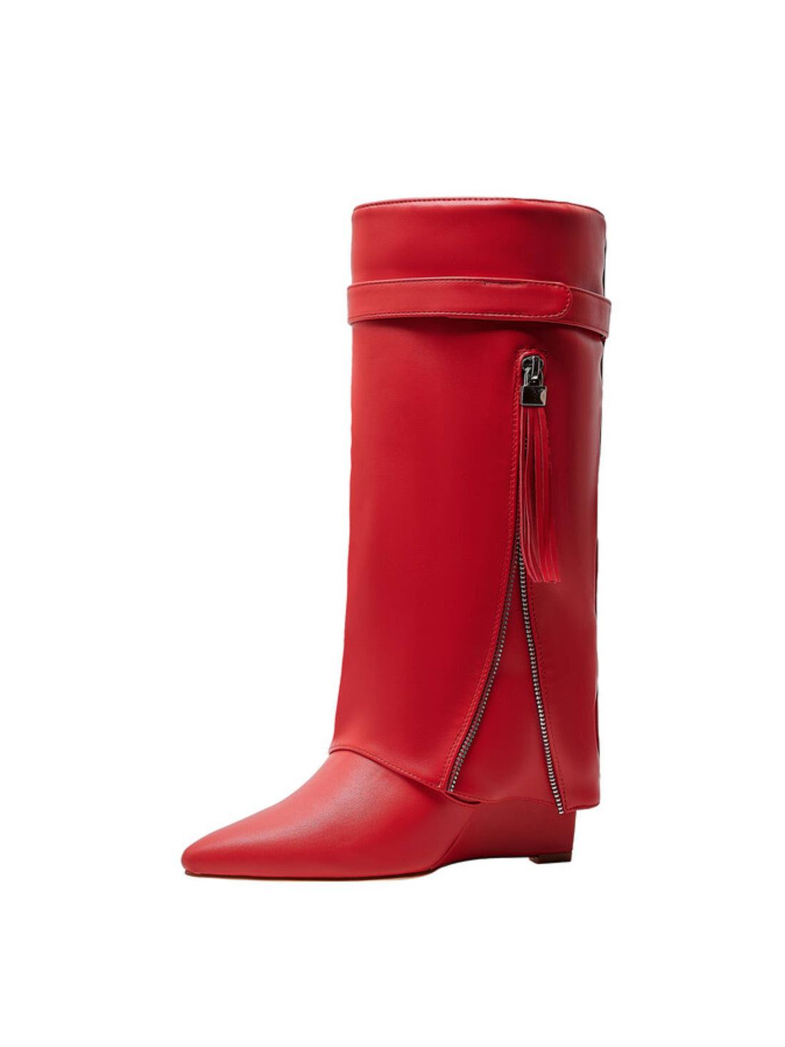 Red Fold Over Western Wedge High Heel Boots Ladies