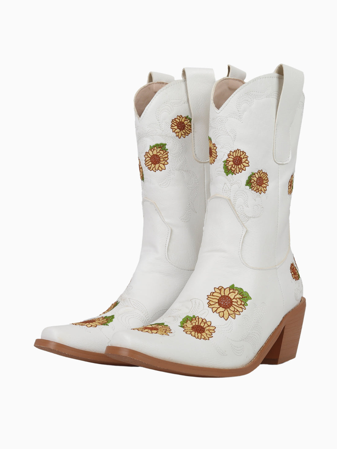 Charming white cowgirl boots adorned with delightful sunflower embroidery in golden yellow and green, perfect...