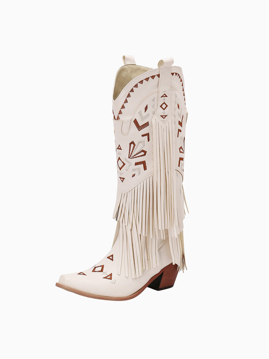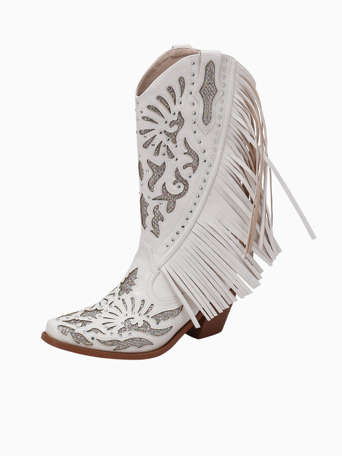 Bohemian Fringe White Mid-Calf Cowgirl Boots