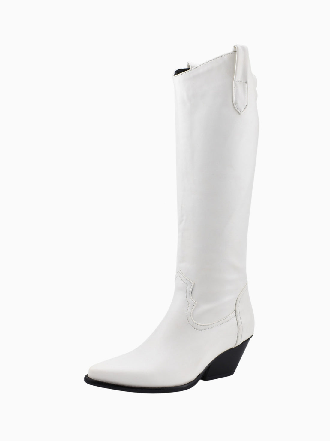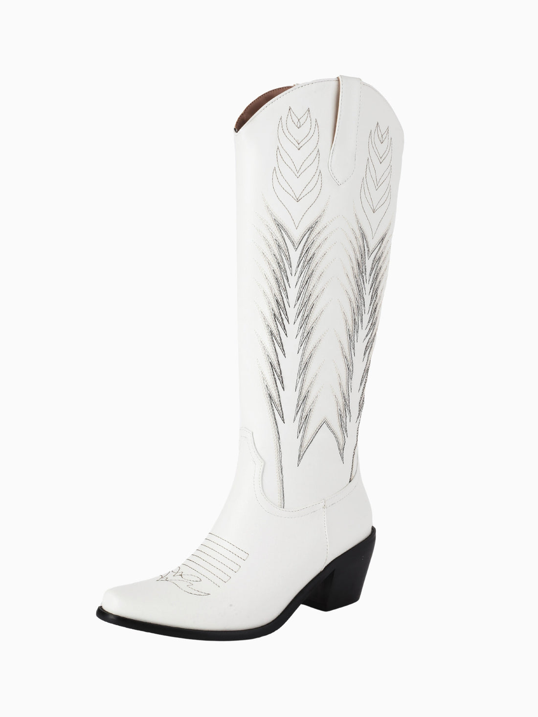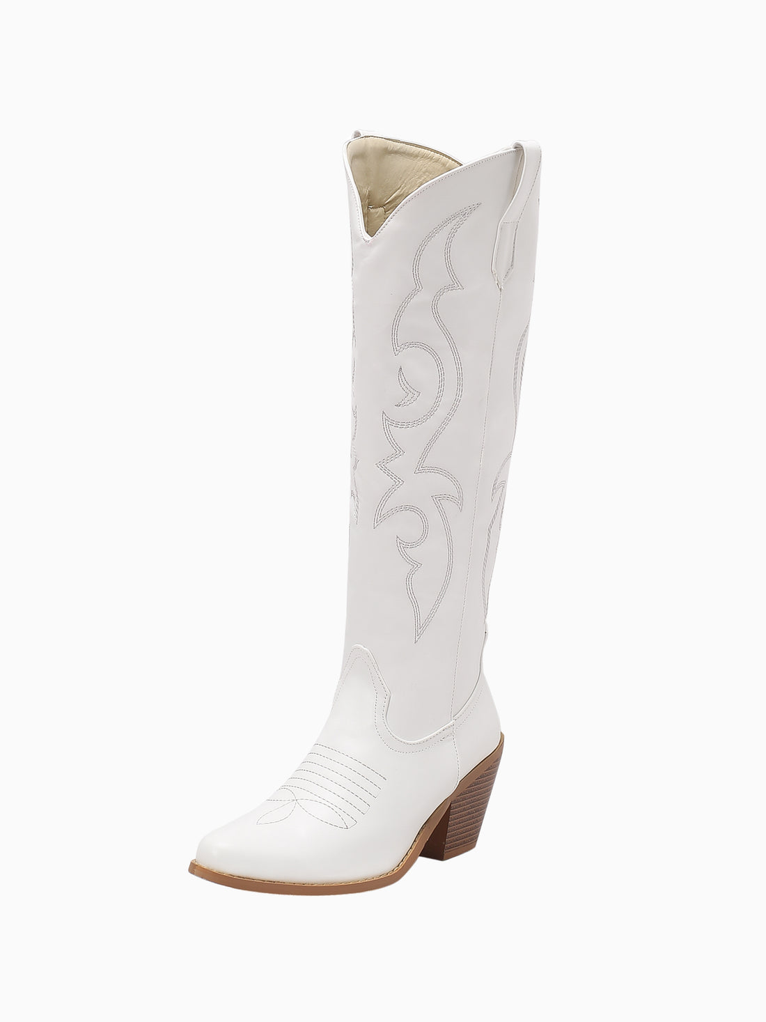 Elegant white tall cowgirl boots featuring graceful wave stitching patterns and stacked heel, perfect for...