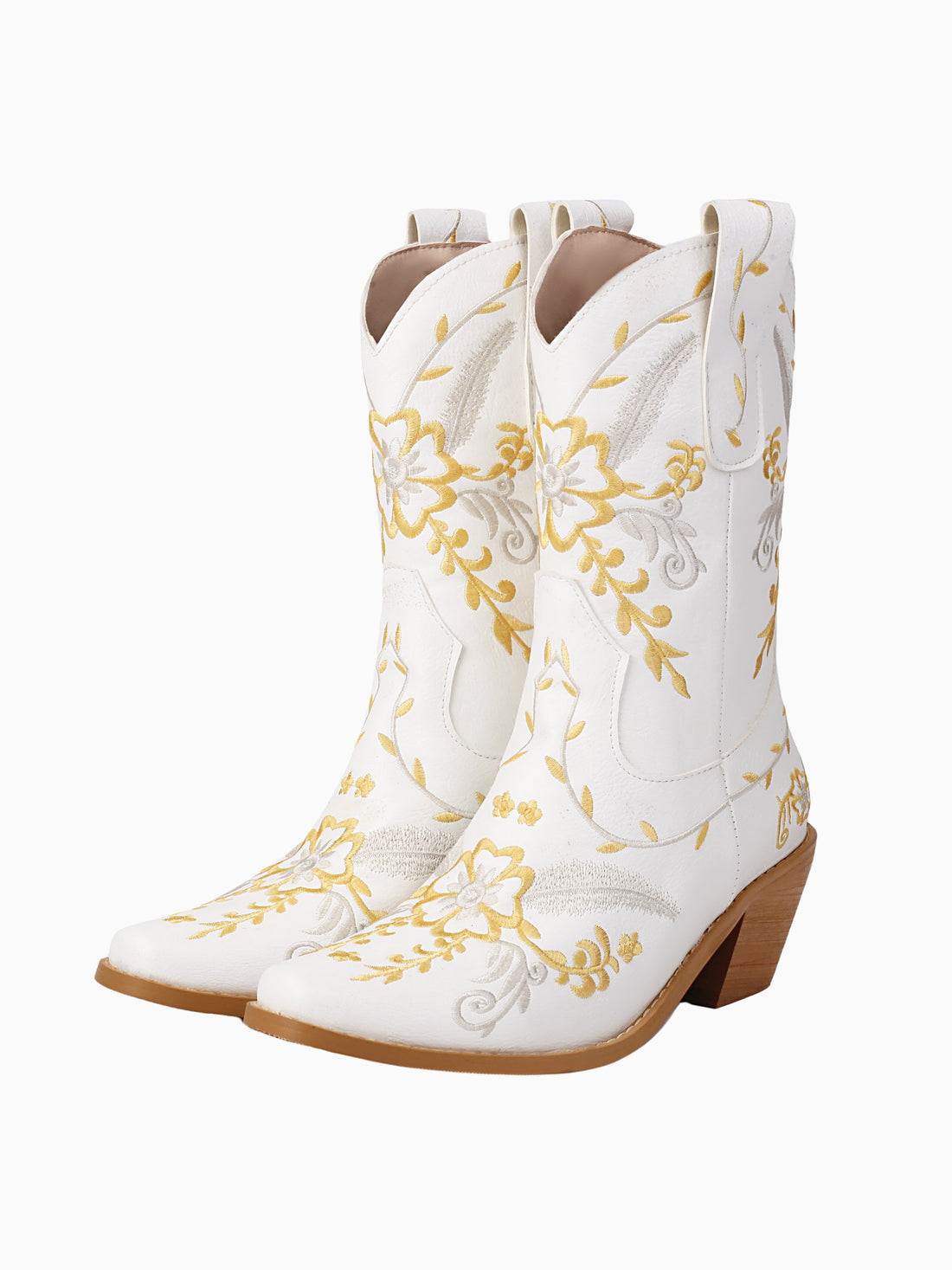 Aztec White Embroidered Plus Size Cowgirl Boots Mid Calf