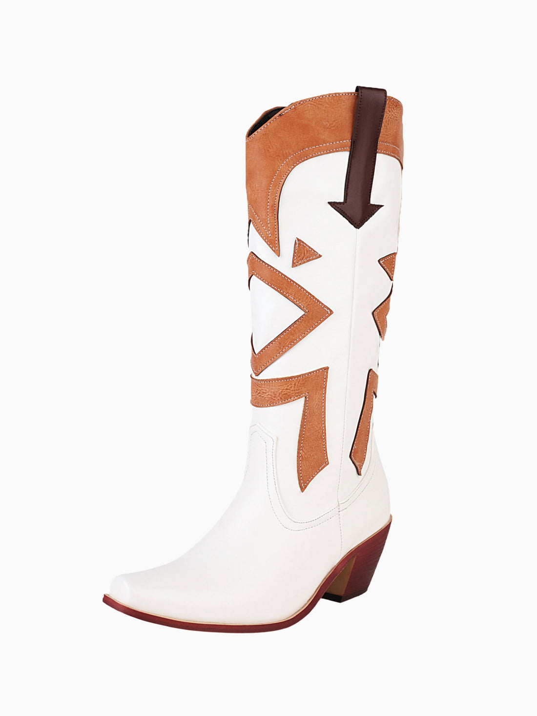 Contemporary white cowgirl boots featuring bold arrow design with brown leather accents and geometric patterns,...
