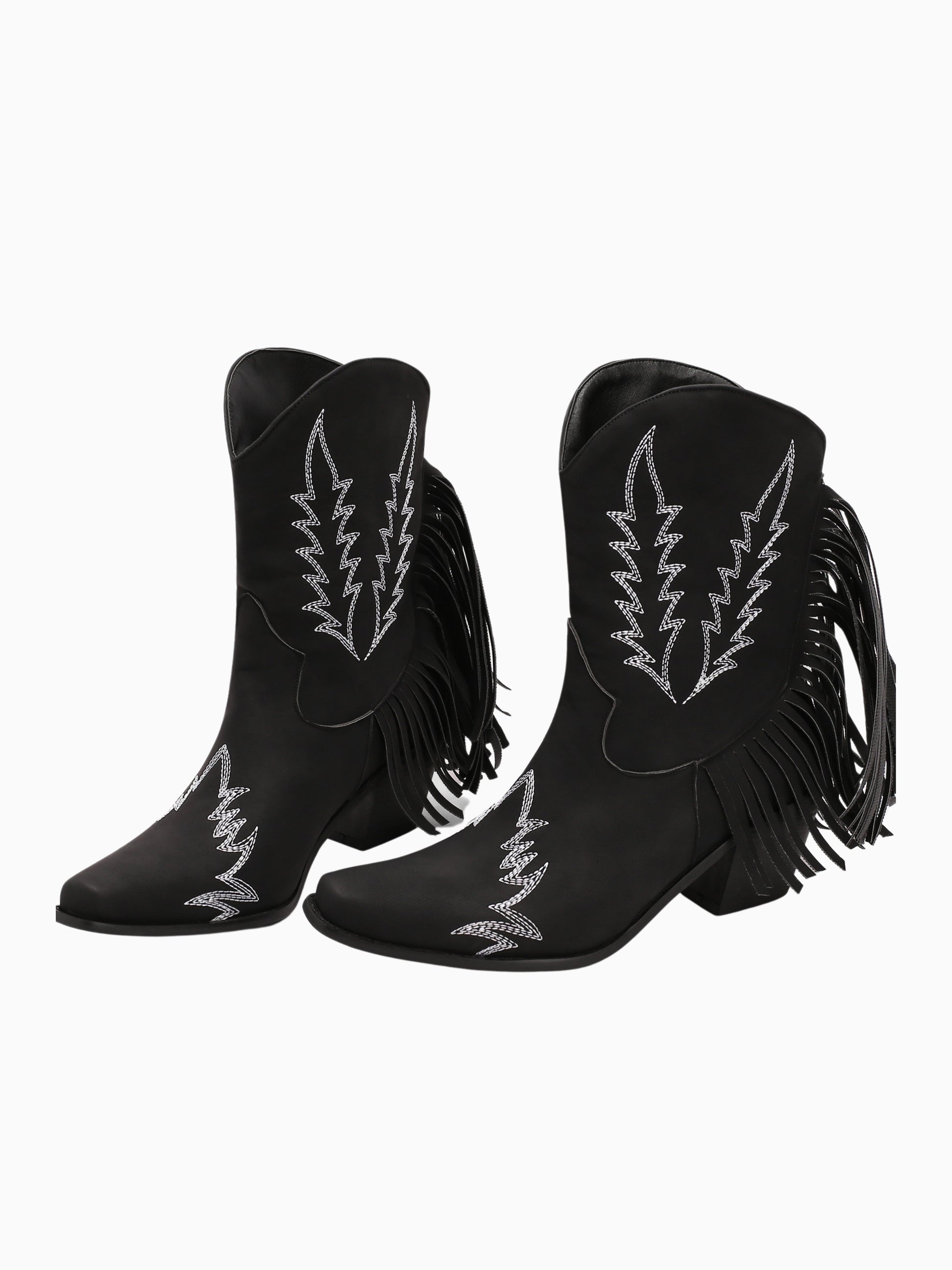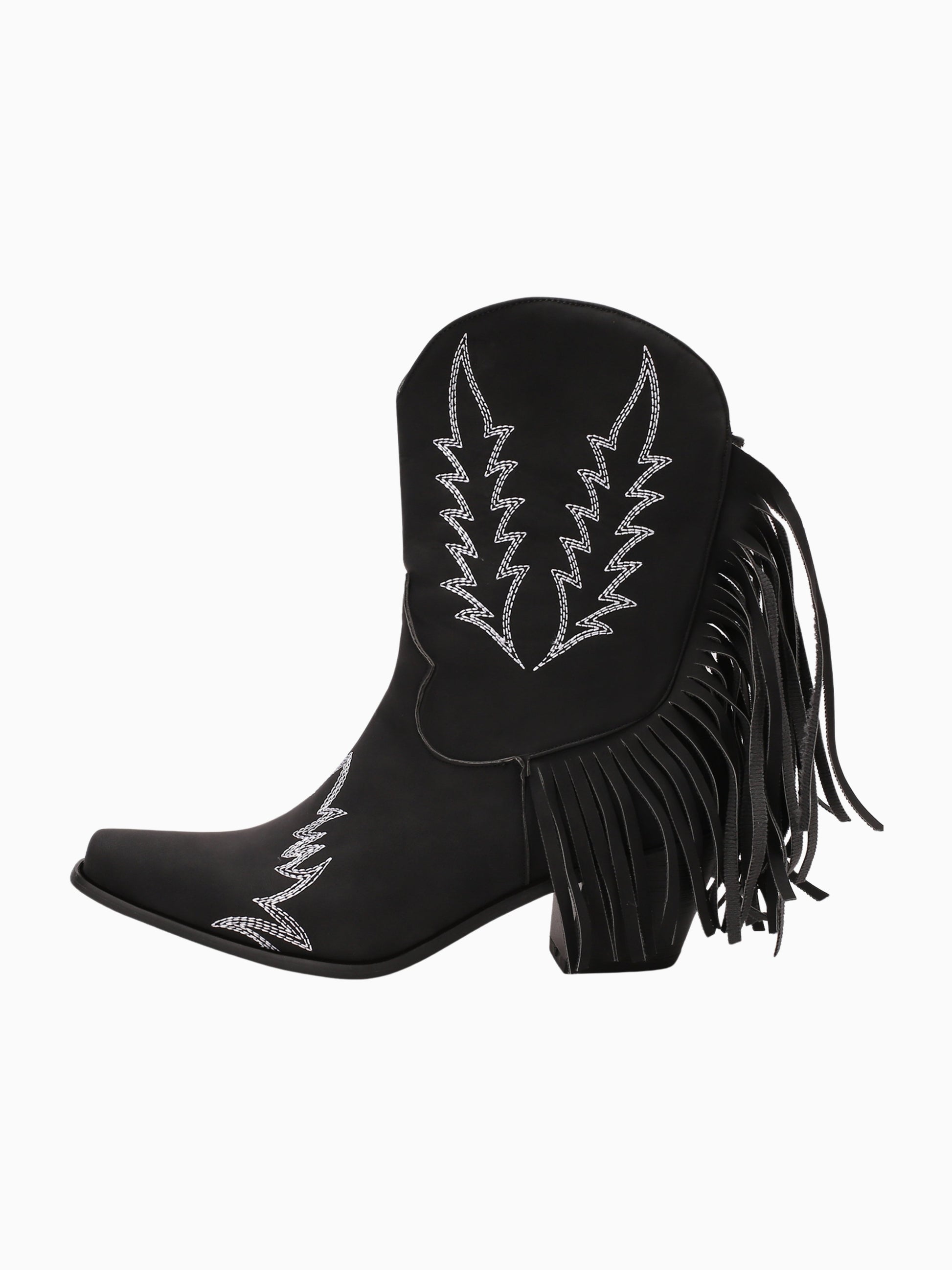 Stylish ankle cowgirl boots featuring elegant black design with eye-catching white stitching patterns. Decorative fringe details add dramatic western flair, while the pointed toe and the heel create a classic silhouette perfect for any outfit.
