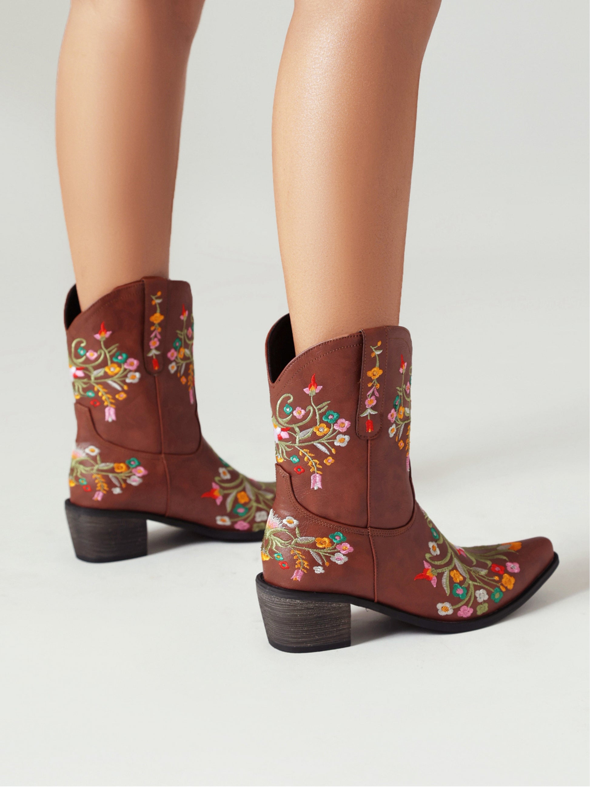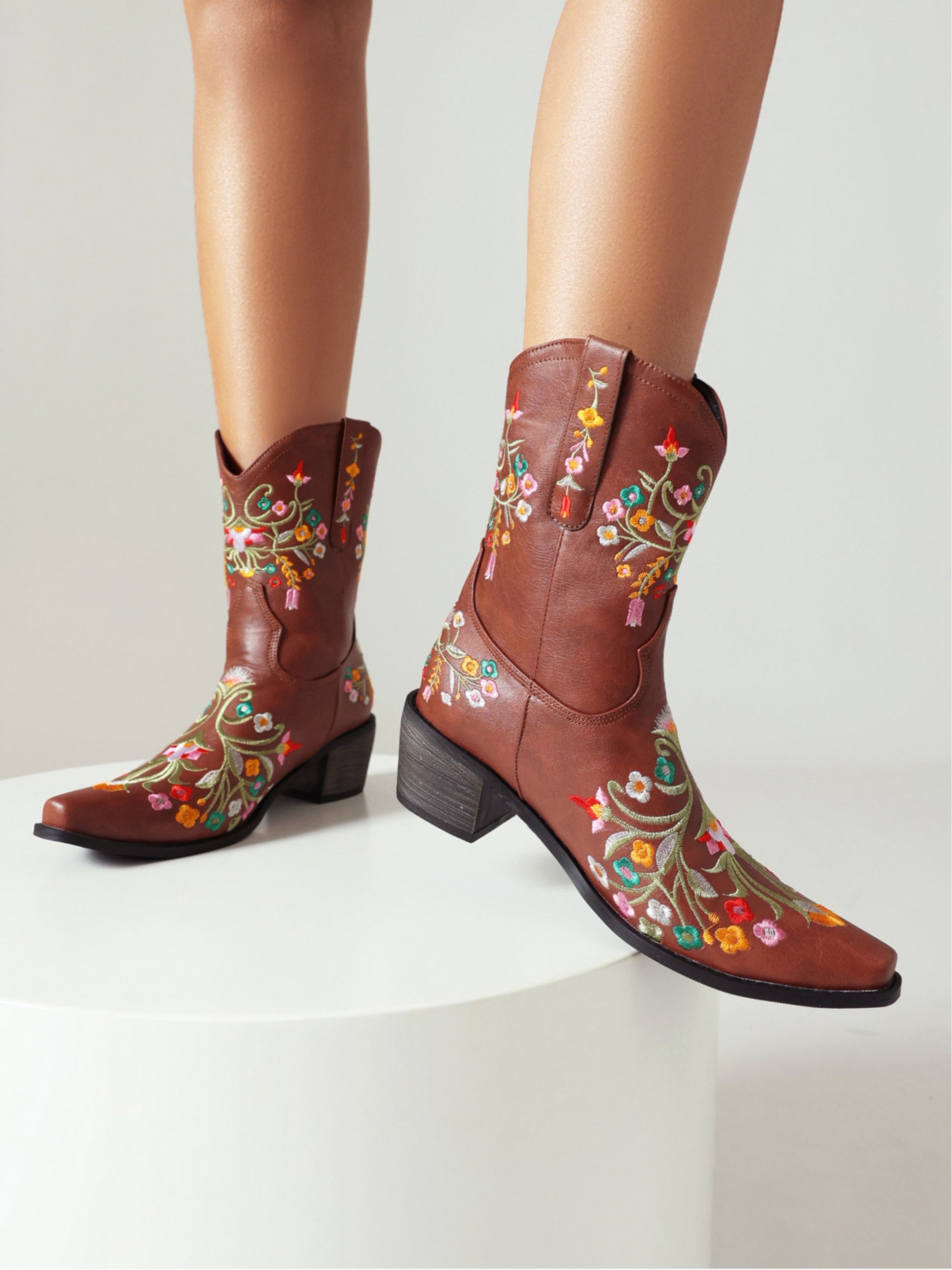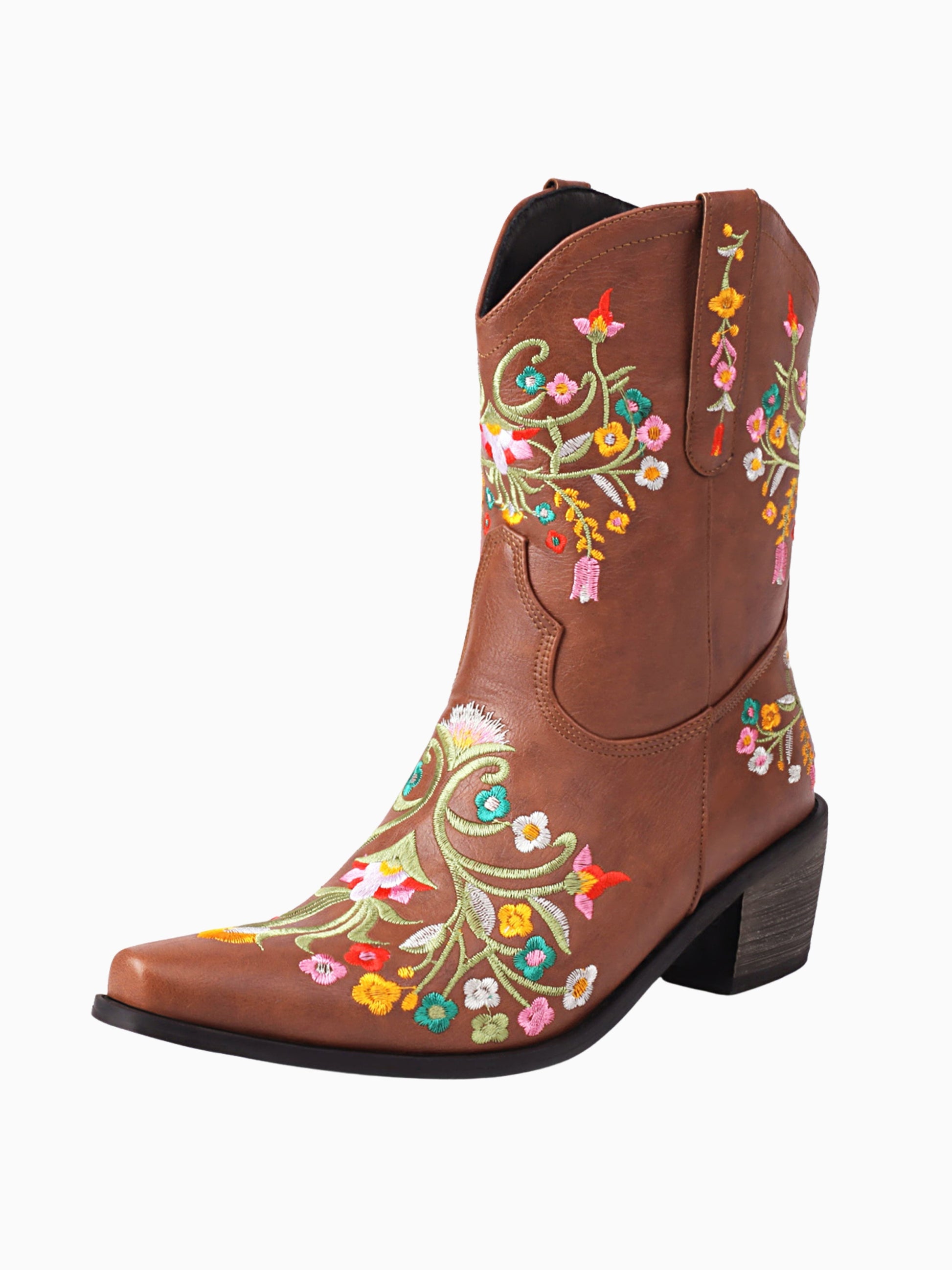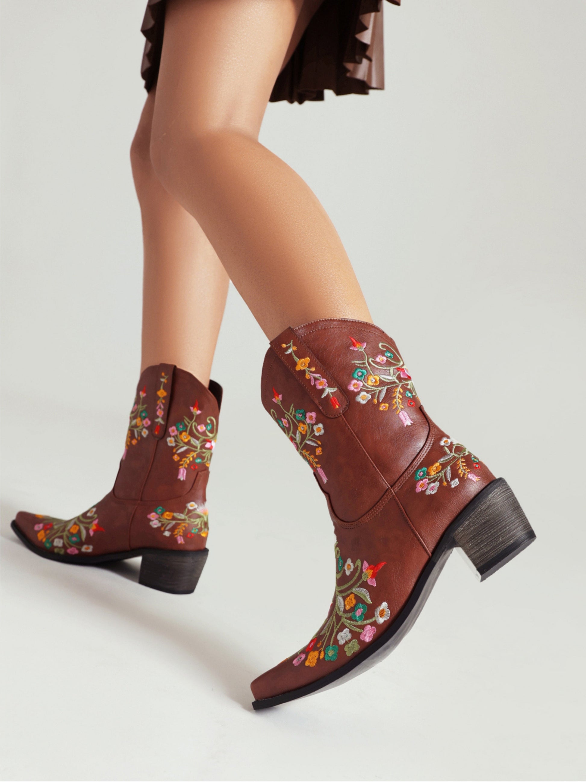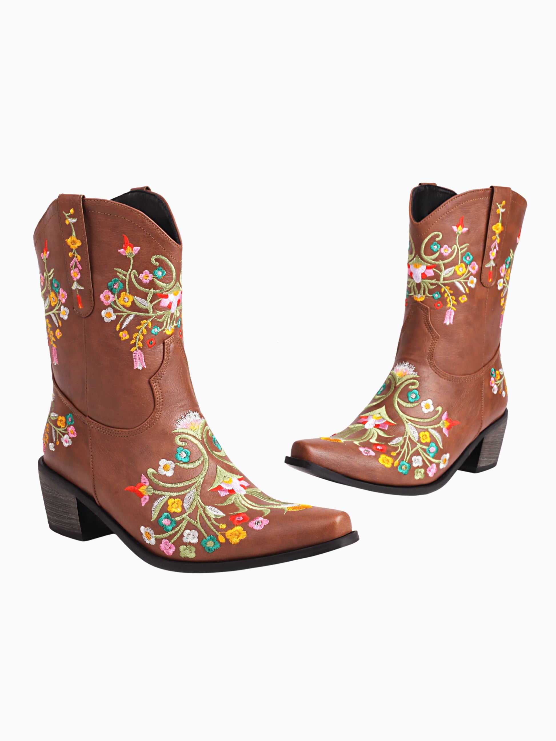 These brown cowgirl boots showcase an artful floral embroidered design, blending bohemian elegance with the classic Western silhouette.