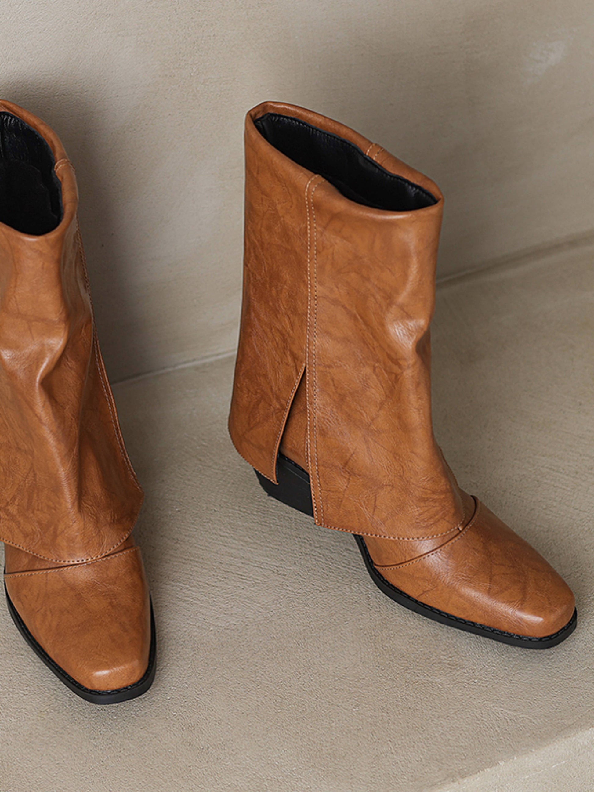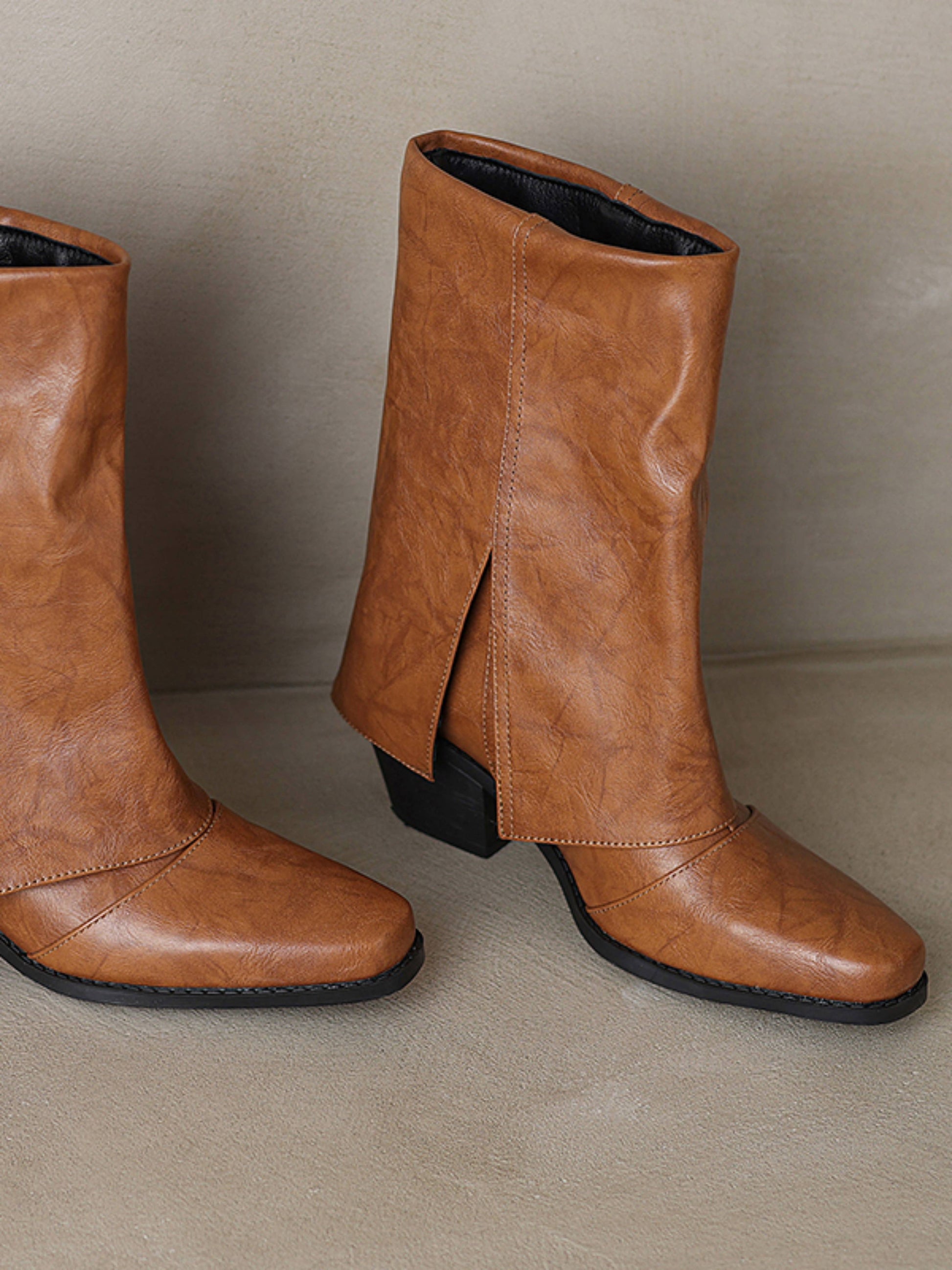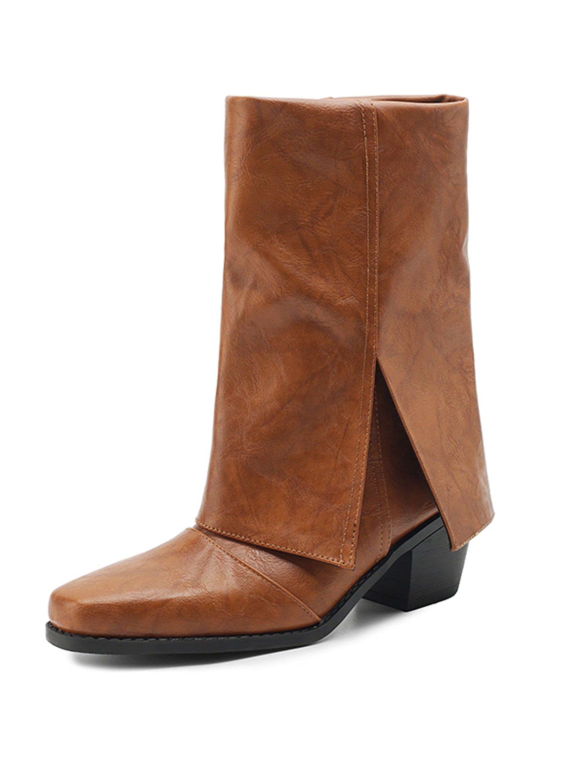 Ladies' Brown Western Ankle Boots feature heeled block heels and a fold-over shaft.