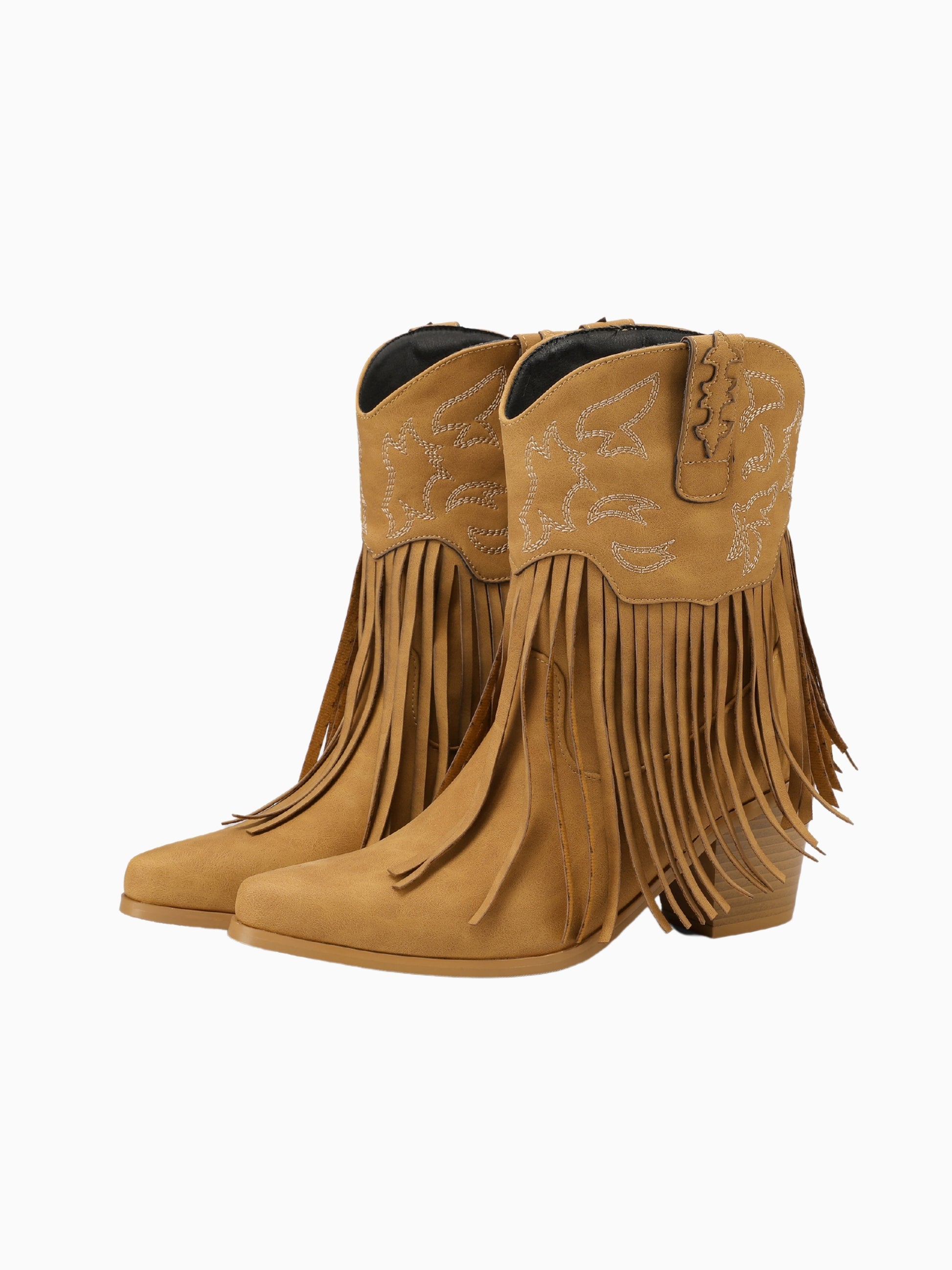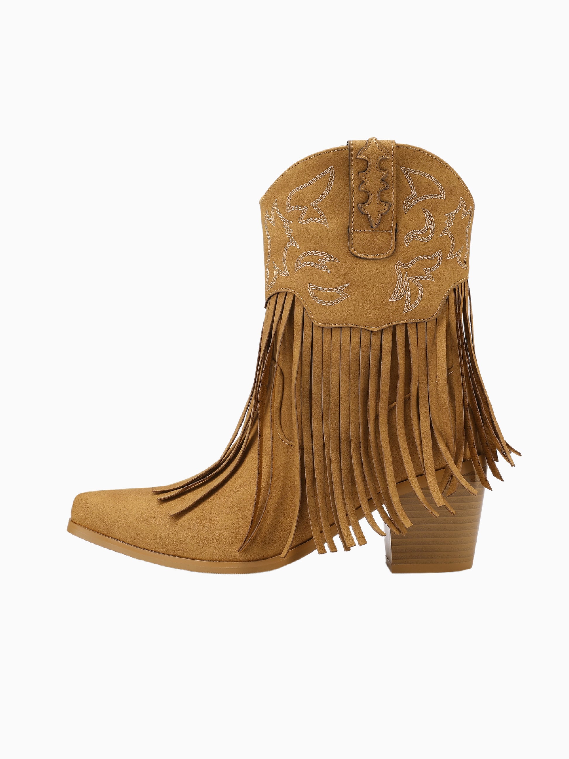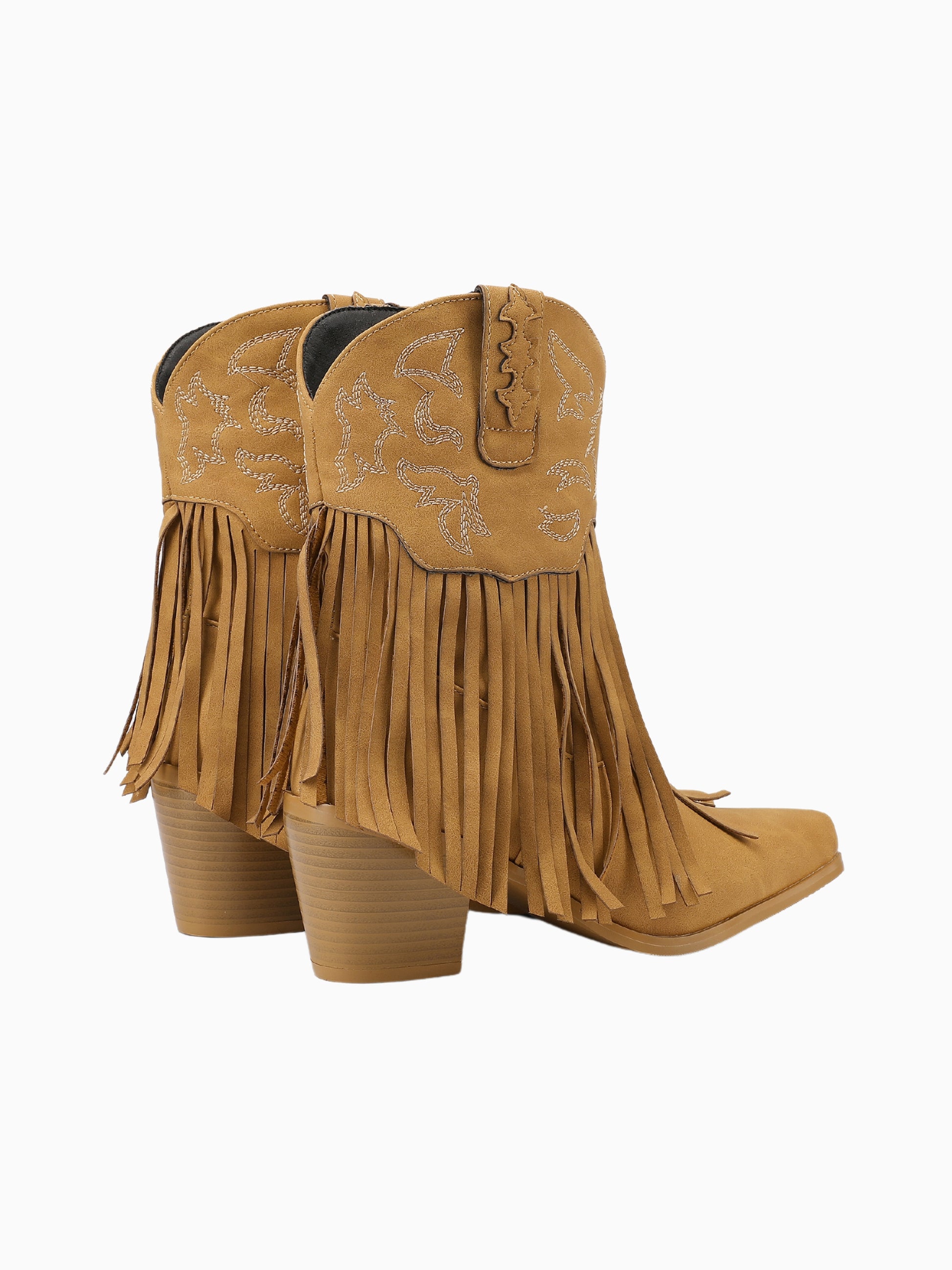 Bohemian Snip Toe Fringe Tan Cowgirl Ankle Boots for Autumn