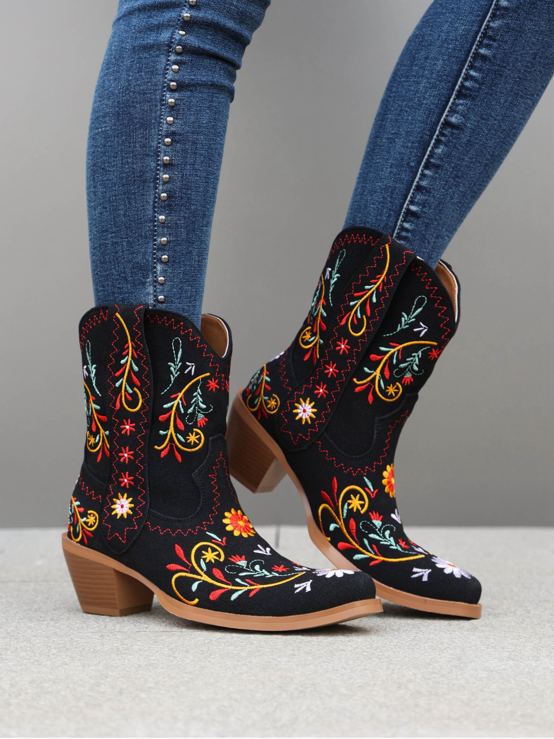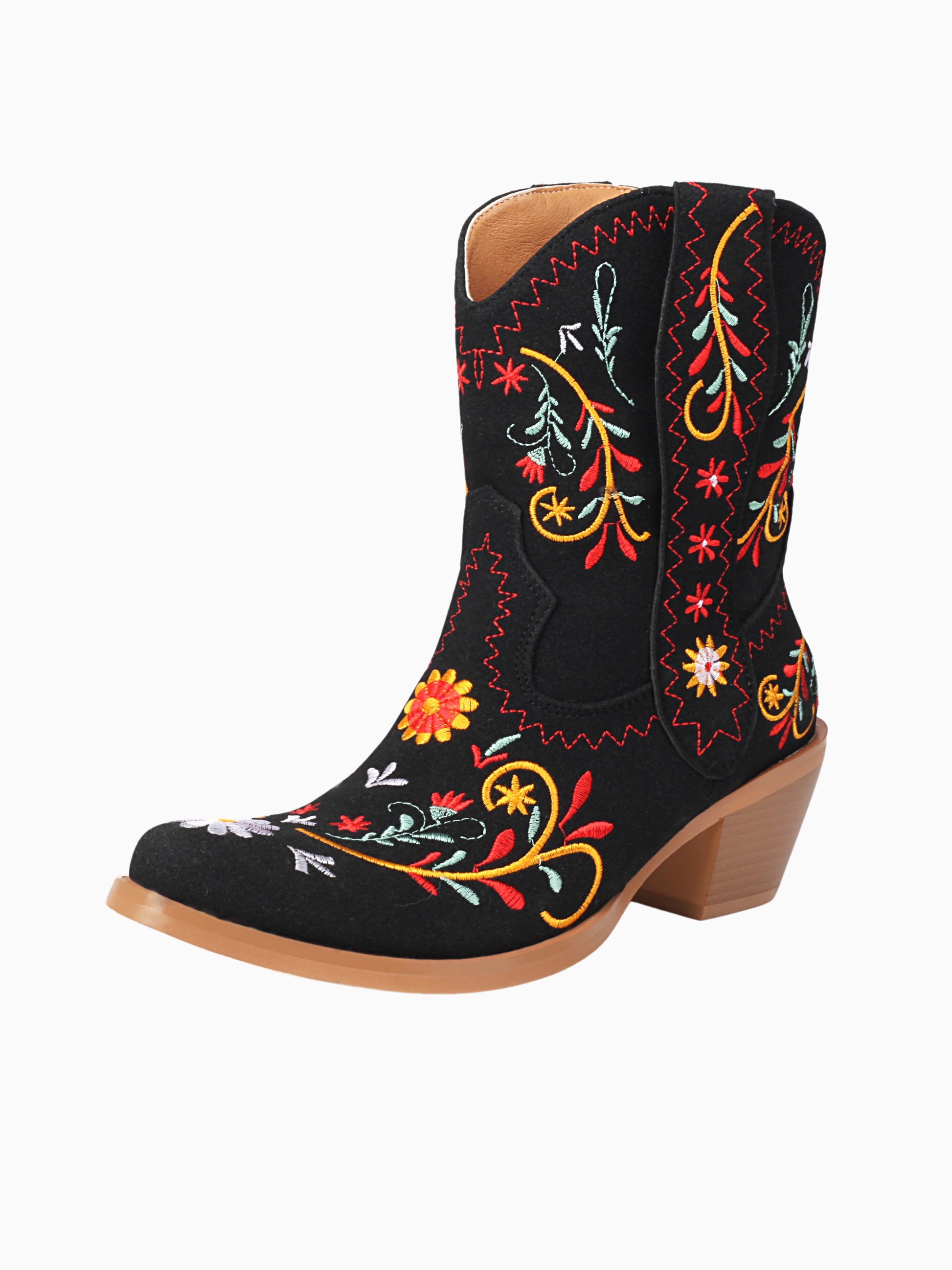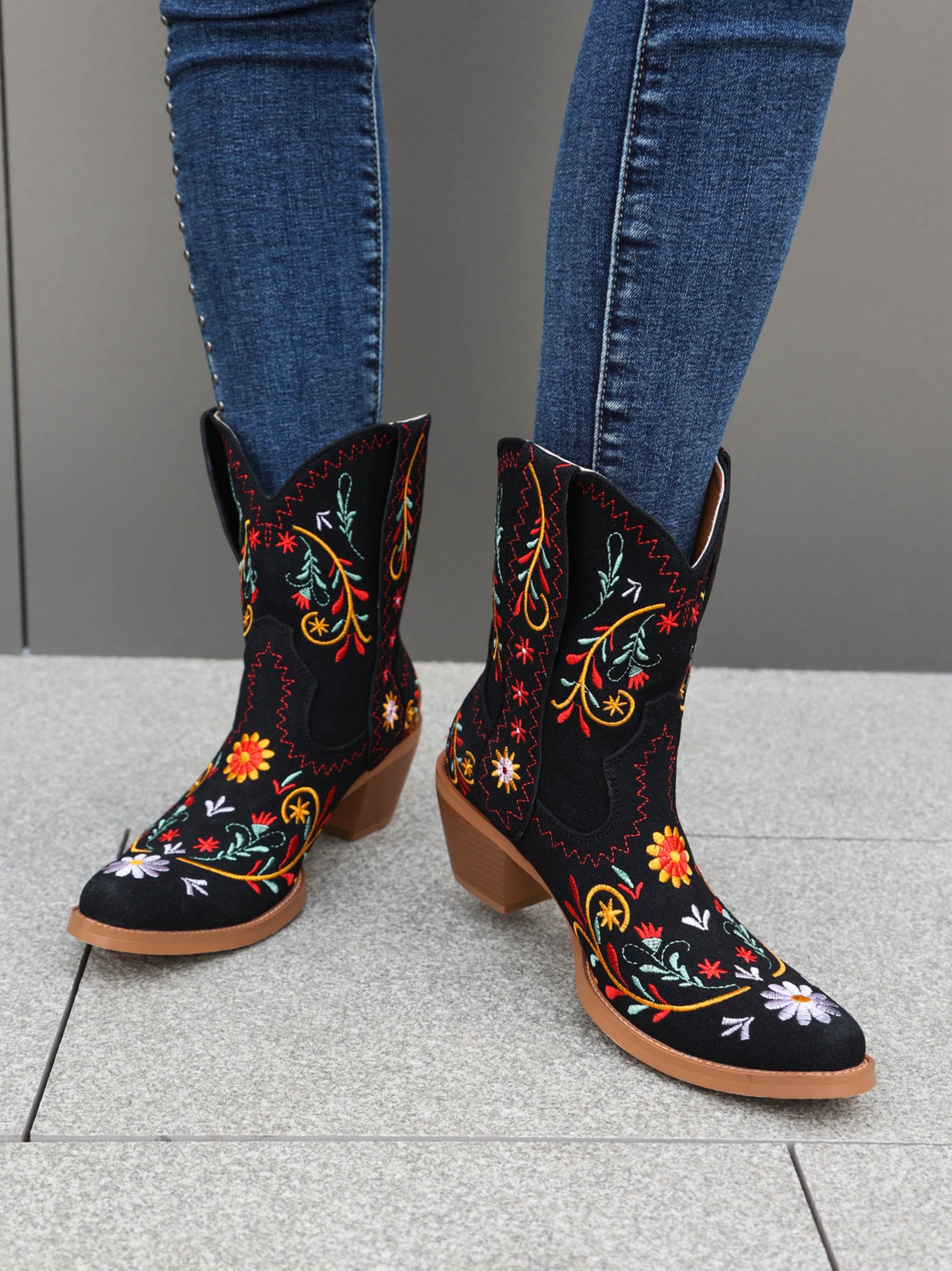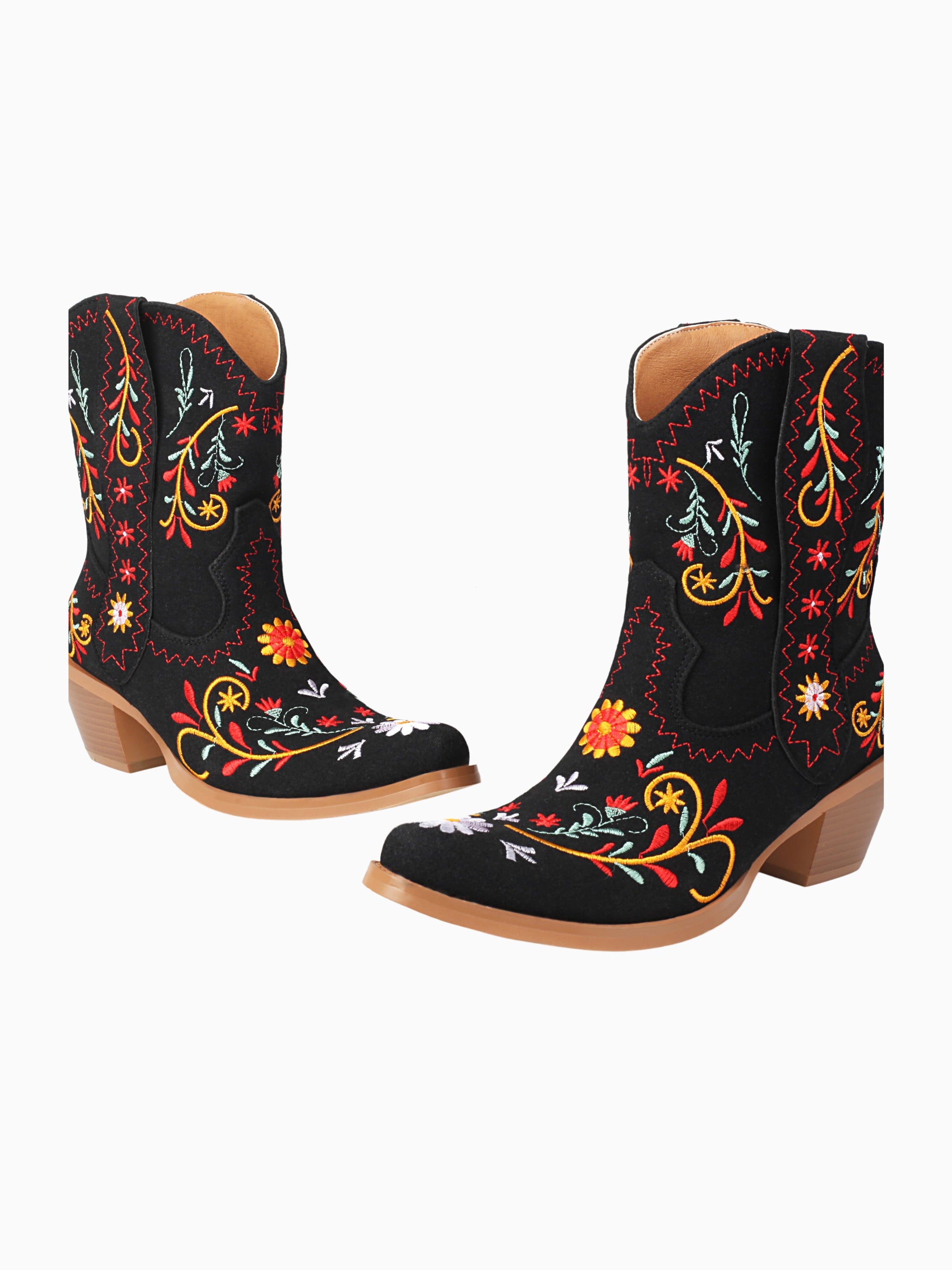 Vibrant black ankle cowgirl boots featuring colorful folk-inspired floral embroidery, blending bohemian charm with Western flair.