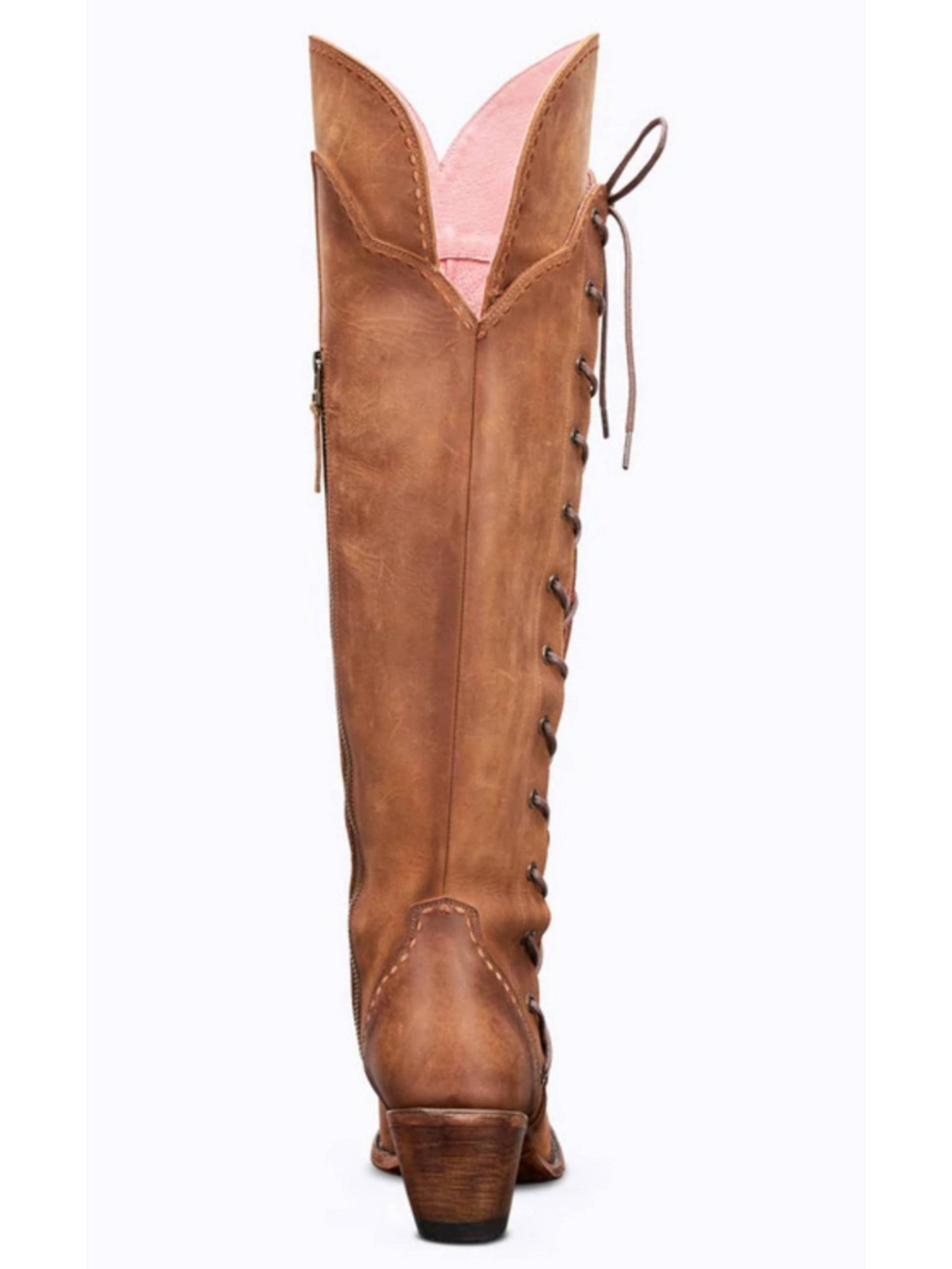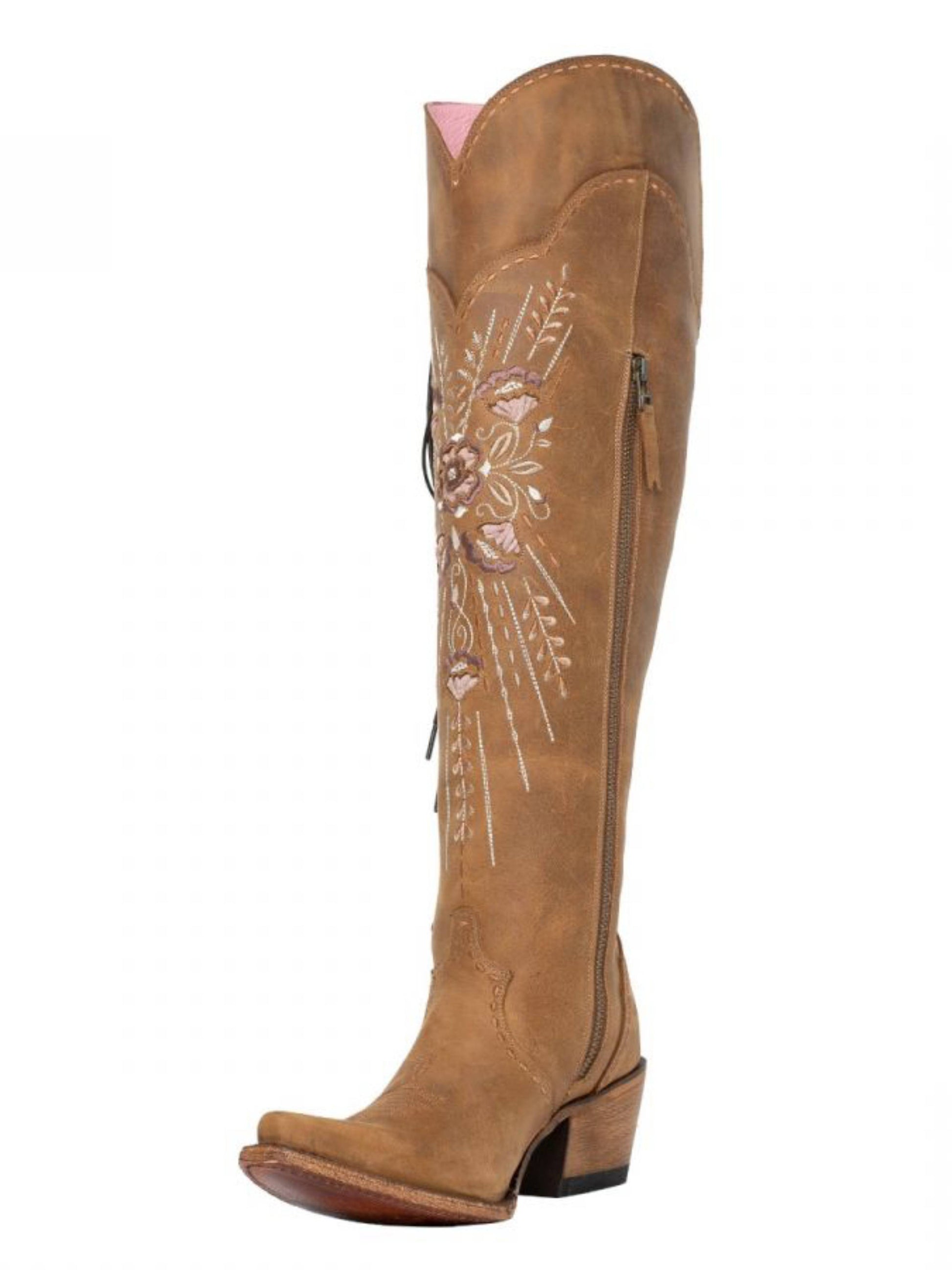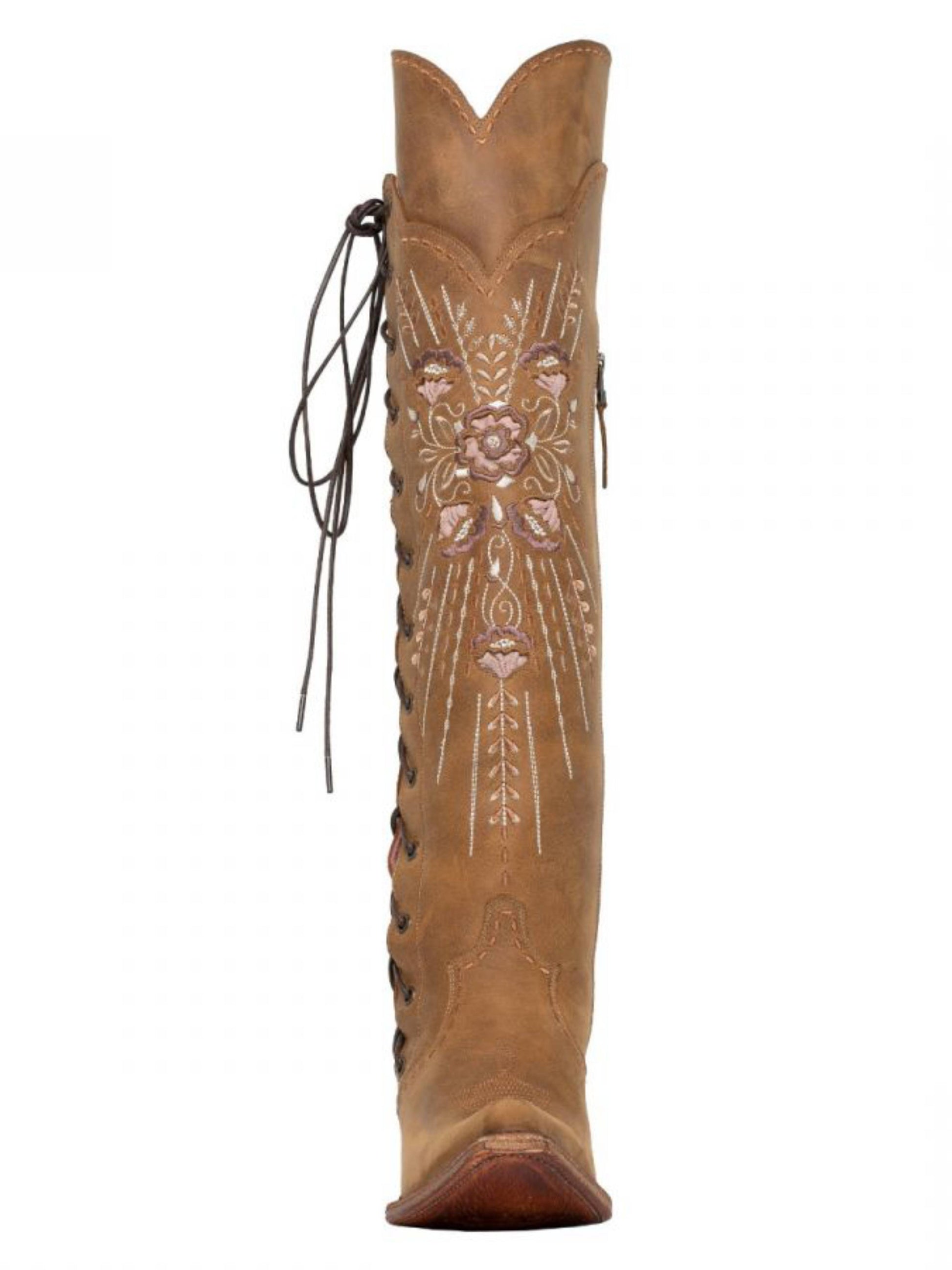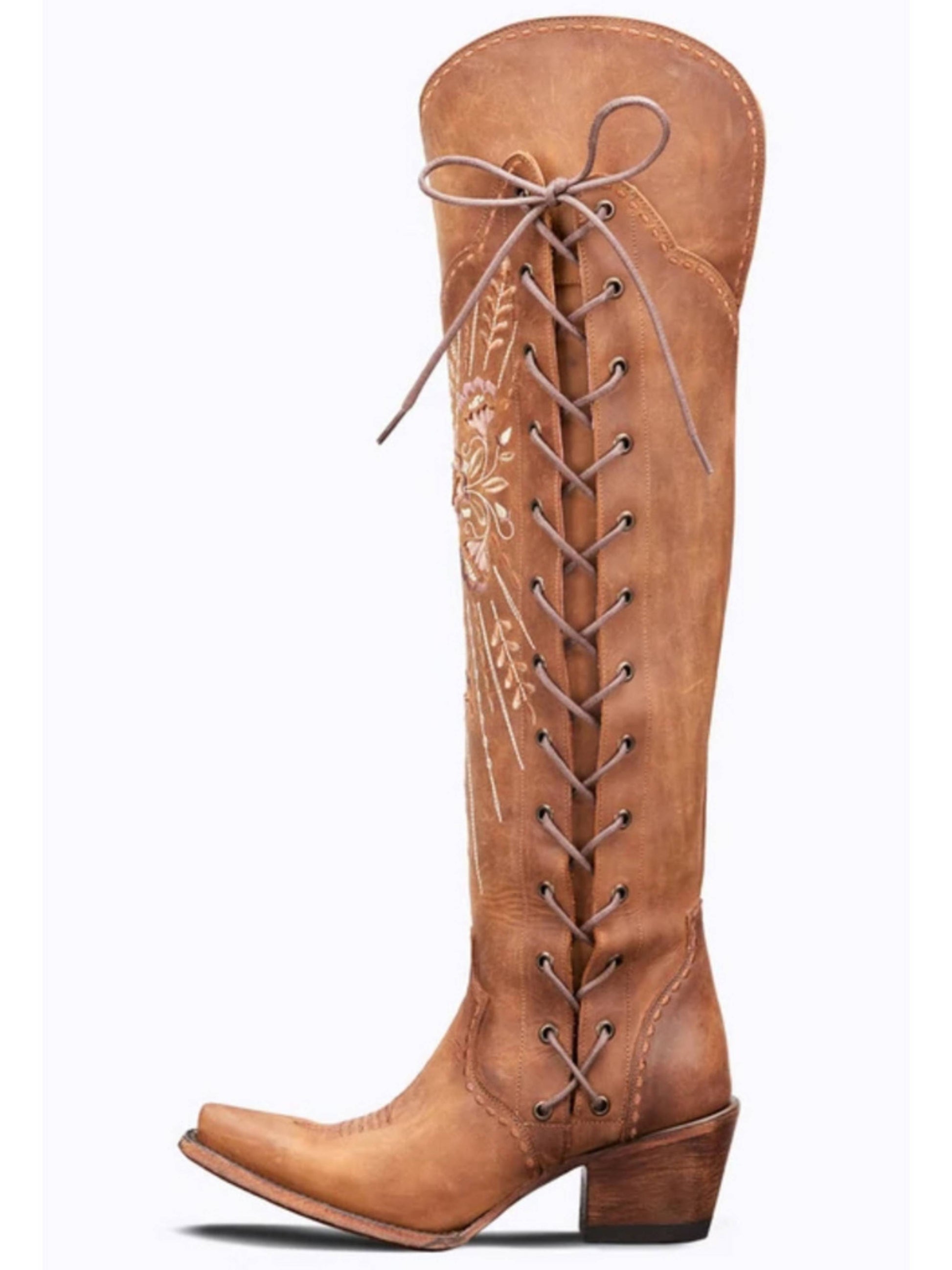 Embroidered Knee-High Brown Distressed Cowgirl Boots for Women feature a lace-up, embroidered flower, and a size-zipper design.