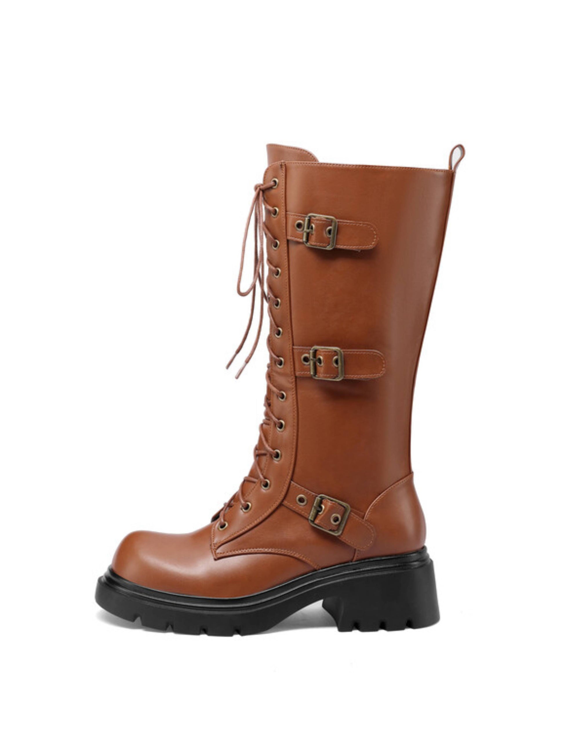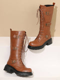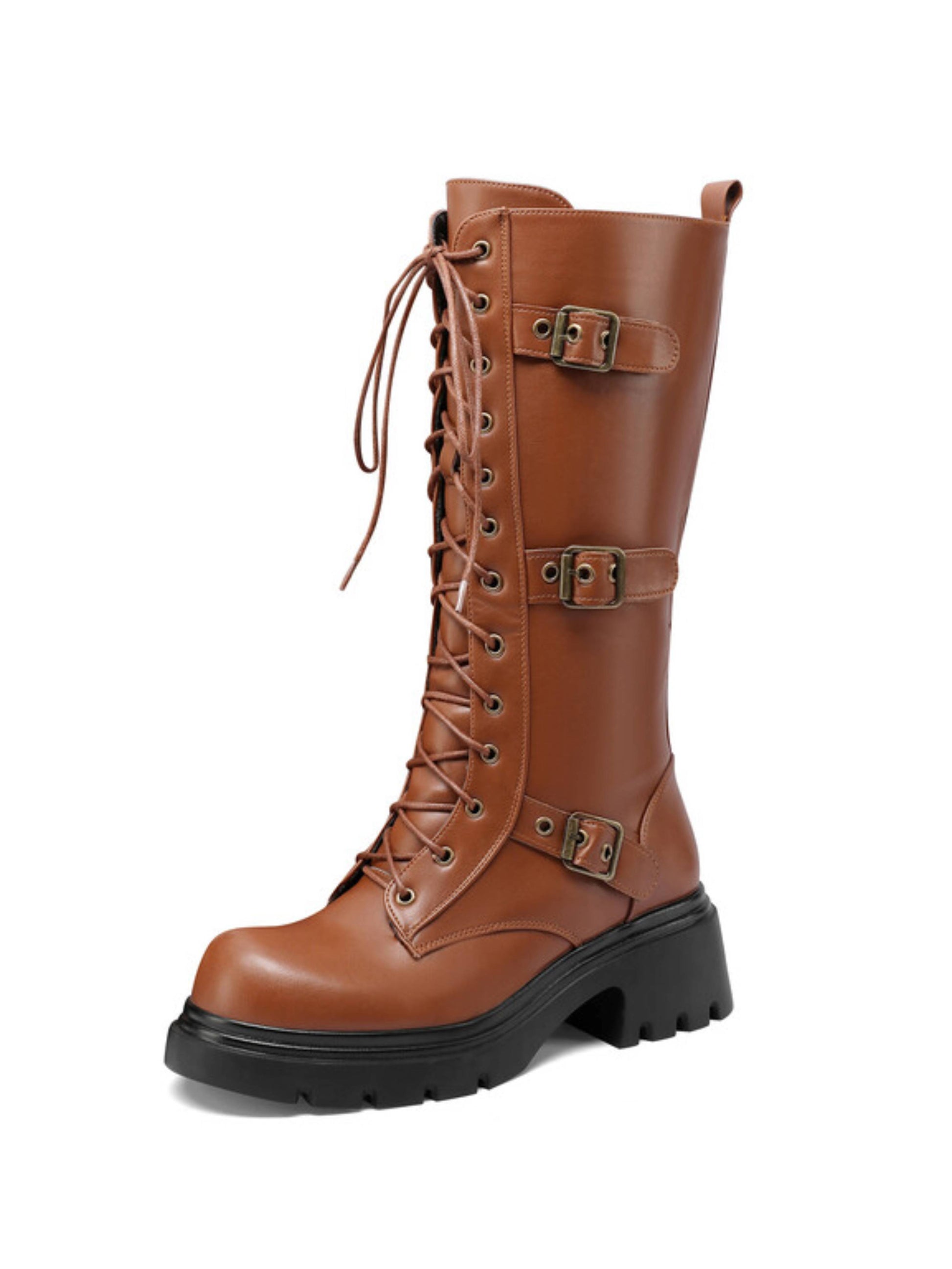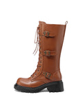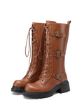 Brown Mid Calf Platform Heel Lace-Up Buckle Combat Boots