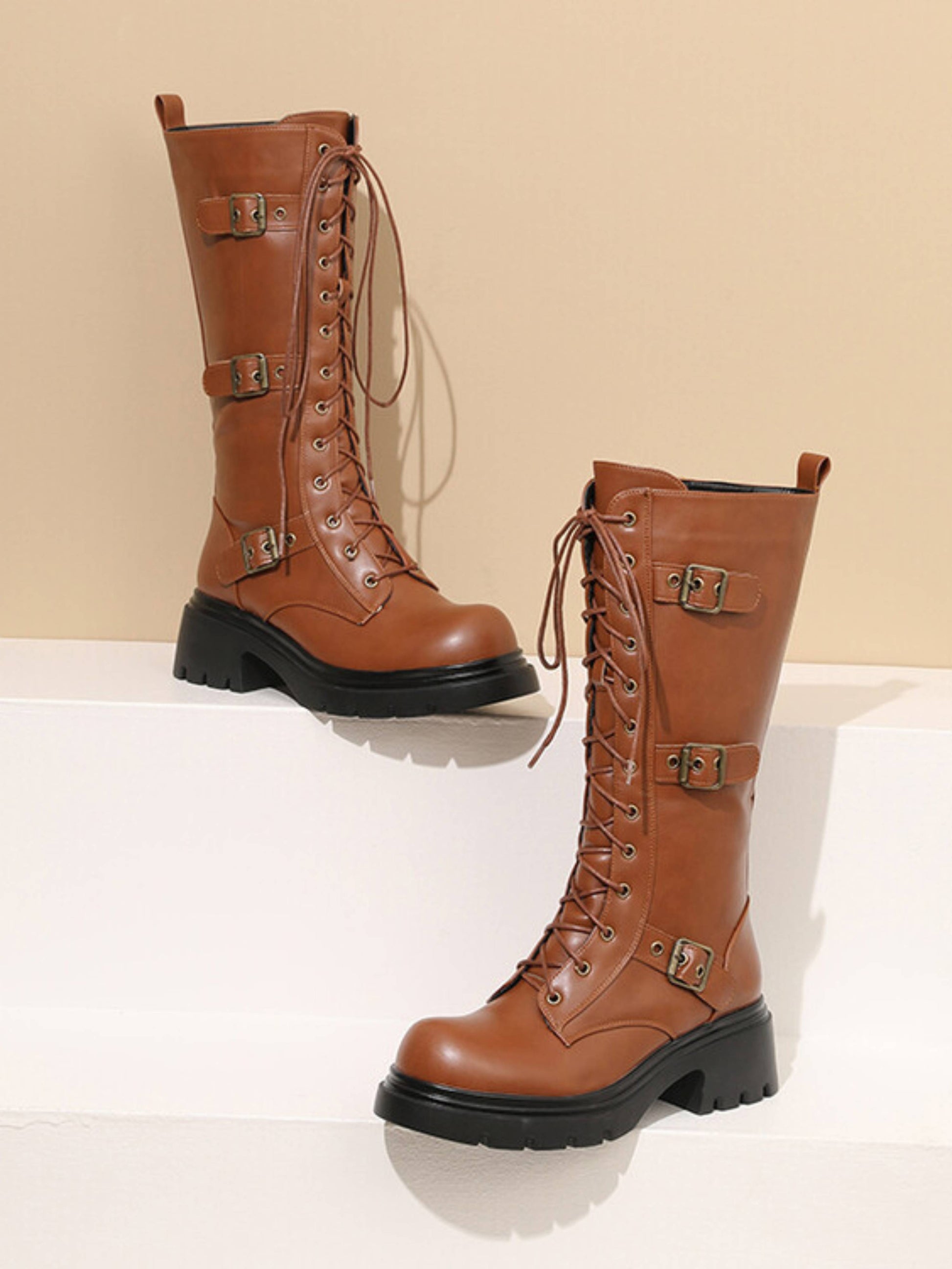 Stylish brown platform combat boots featuring lace-up front, buckled belt accents, chunky heels, and convenient side zipper at mid-calf height. These versatile boots blend rugged combat style with elevated platforms, perfect for trendy brown lace-up boots and statement platform heel footwear.