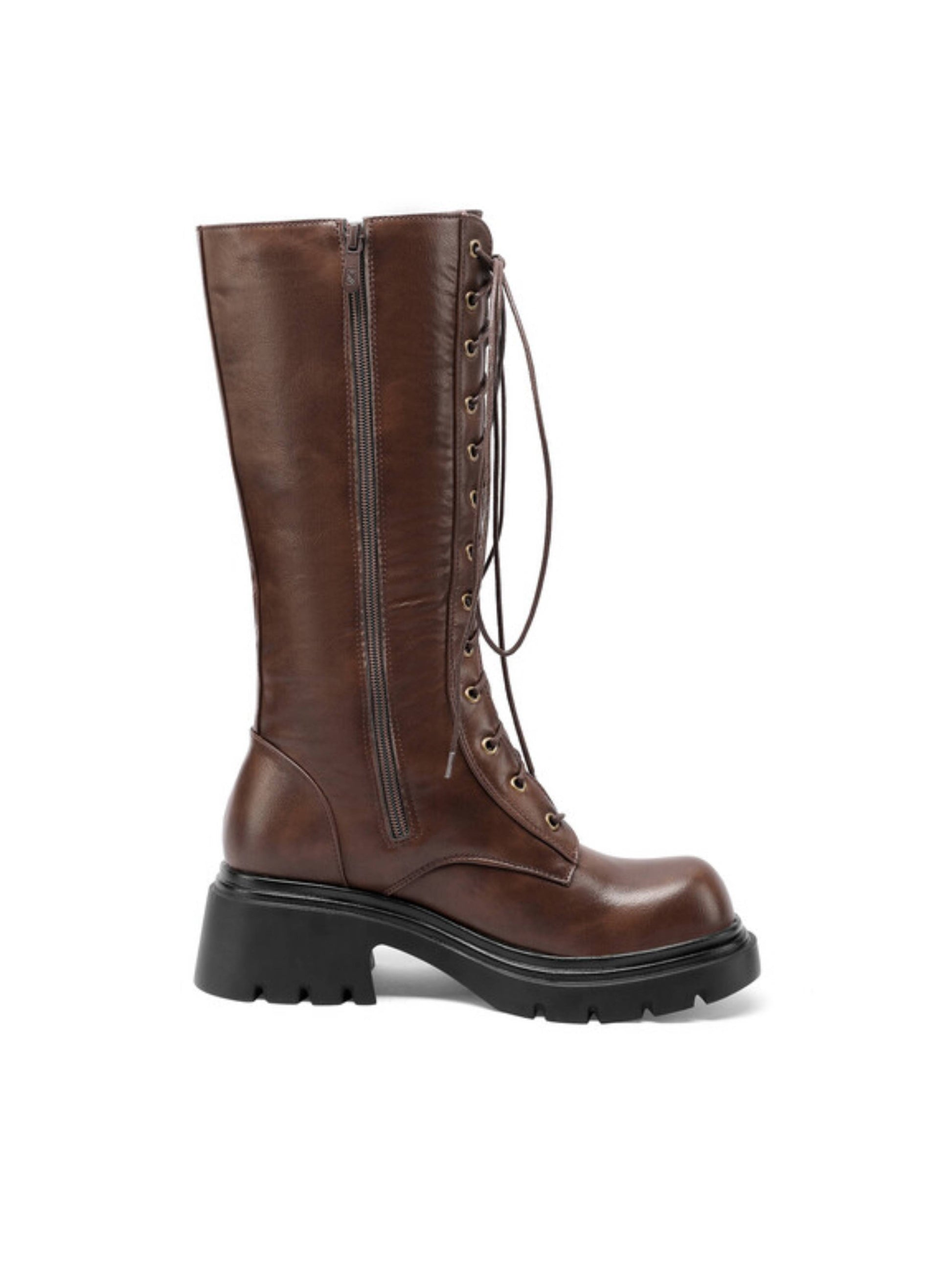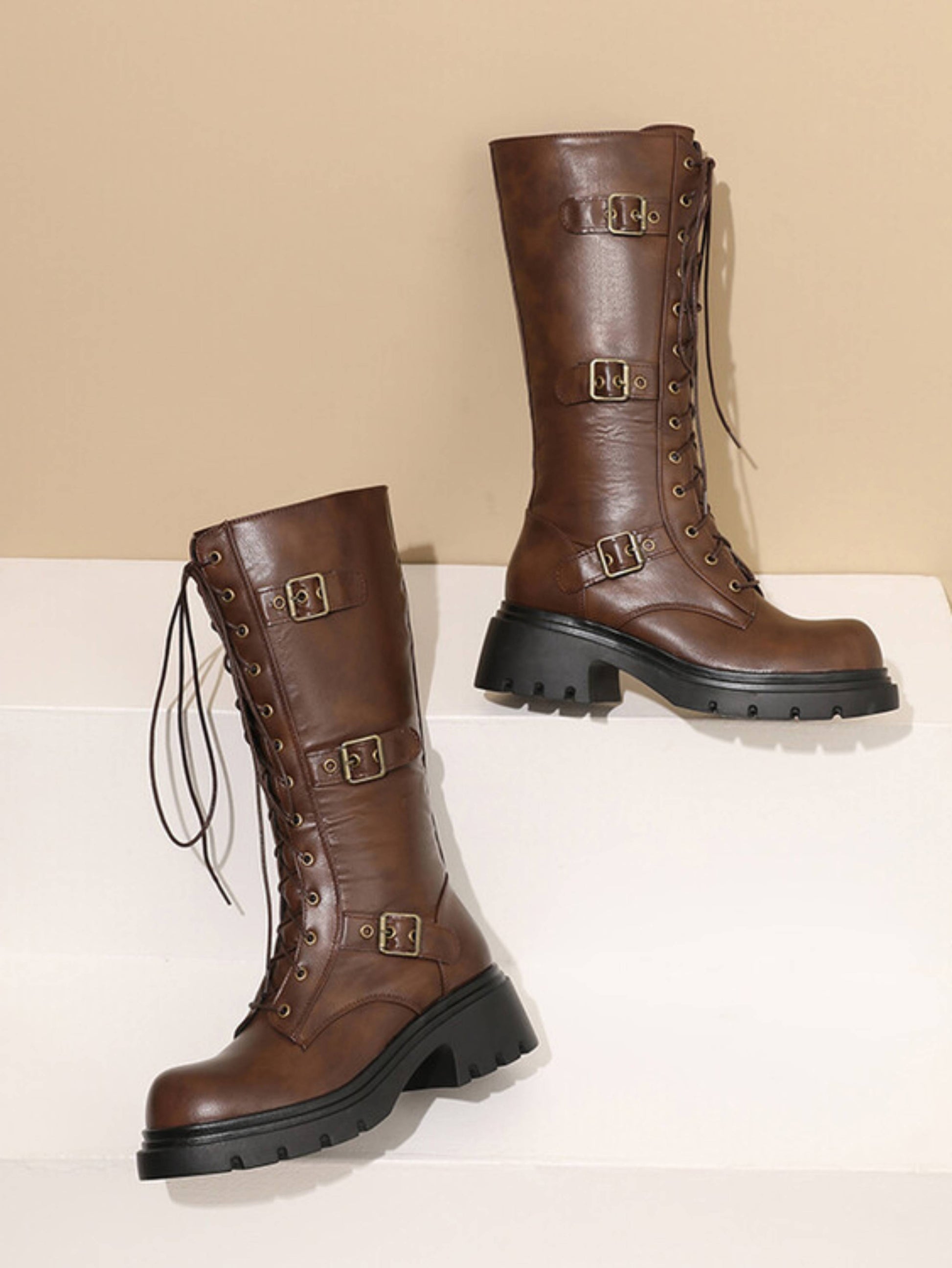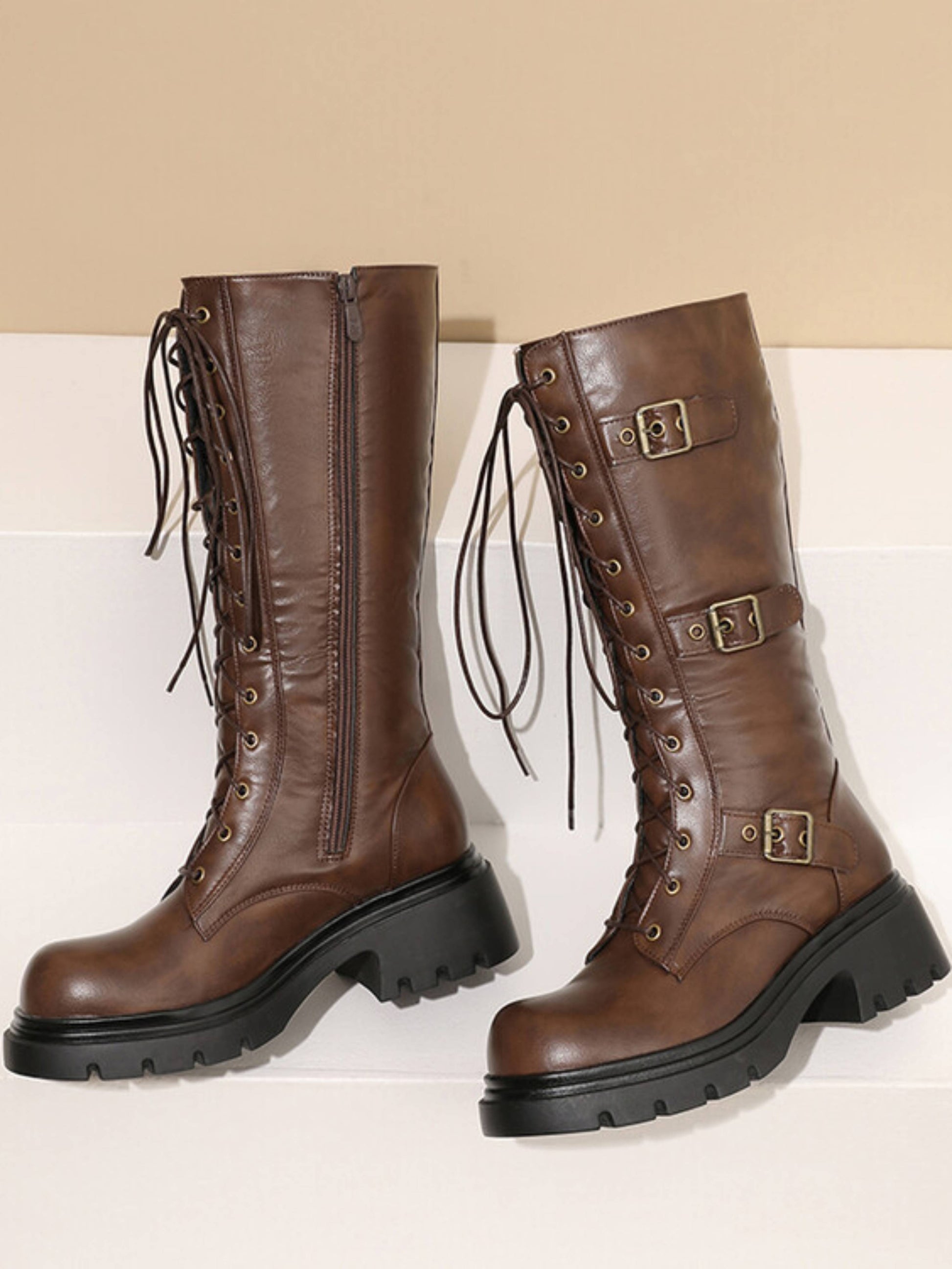 Edgy dark brown platform combat boots featuring buckled belt details, lace-up front, chunky platform heels, and side zipper closure at mid-calf. These statement boots combine military-inspired design with elevated platforms, perfect for trendy lace-up combat boots and brown platform footwear lovers.