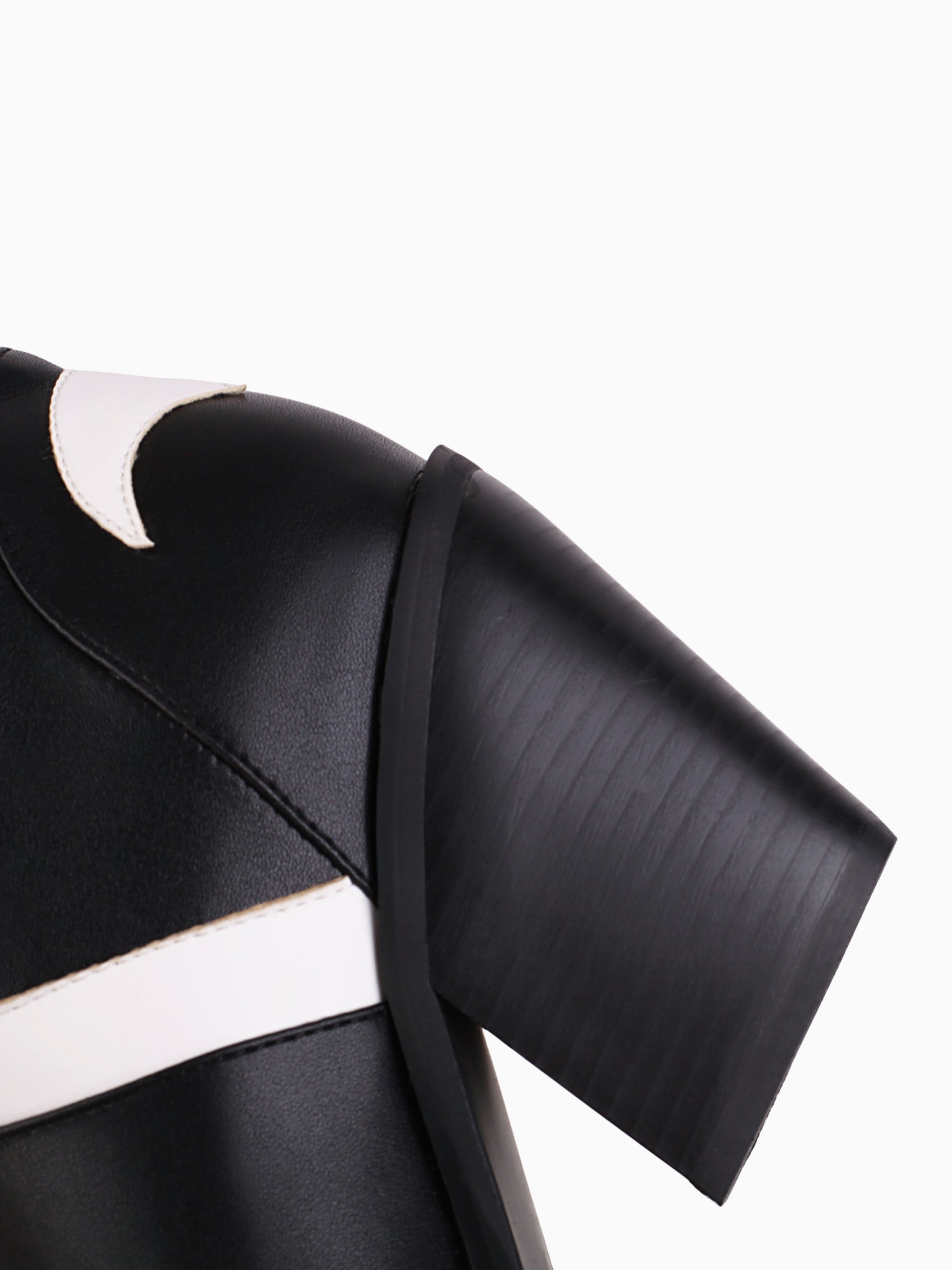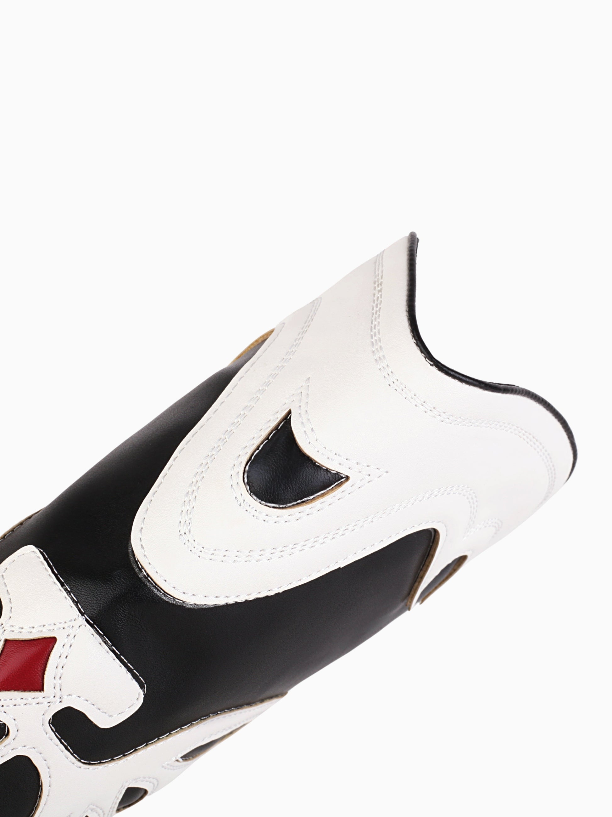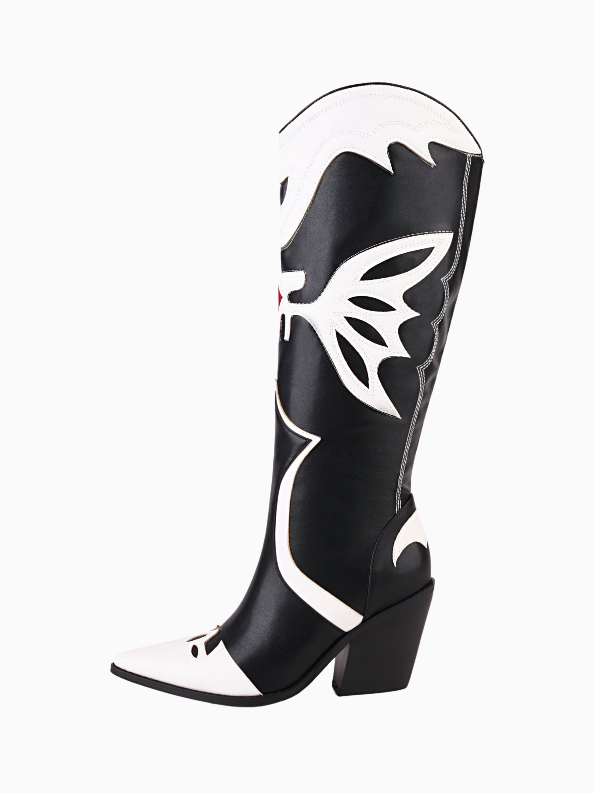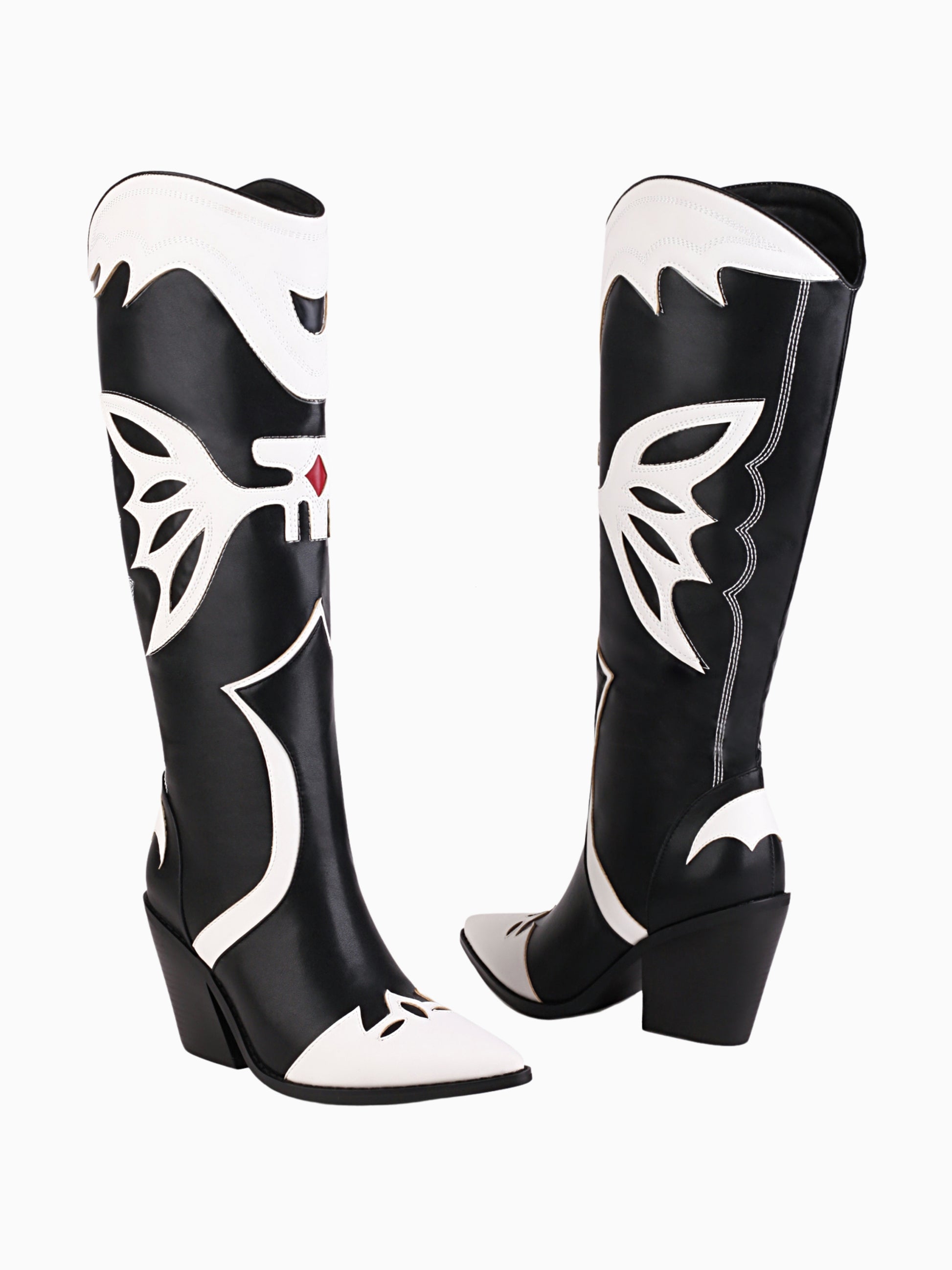 Butterfly Wing Black and White Cowgirl Boots with butterfly-patterned design and knee-high length. The dramatic black-and-white design creates a captivating silhouette, while the red-eye details add a touch of mystery.